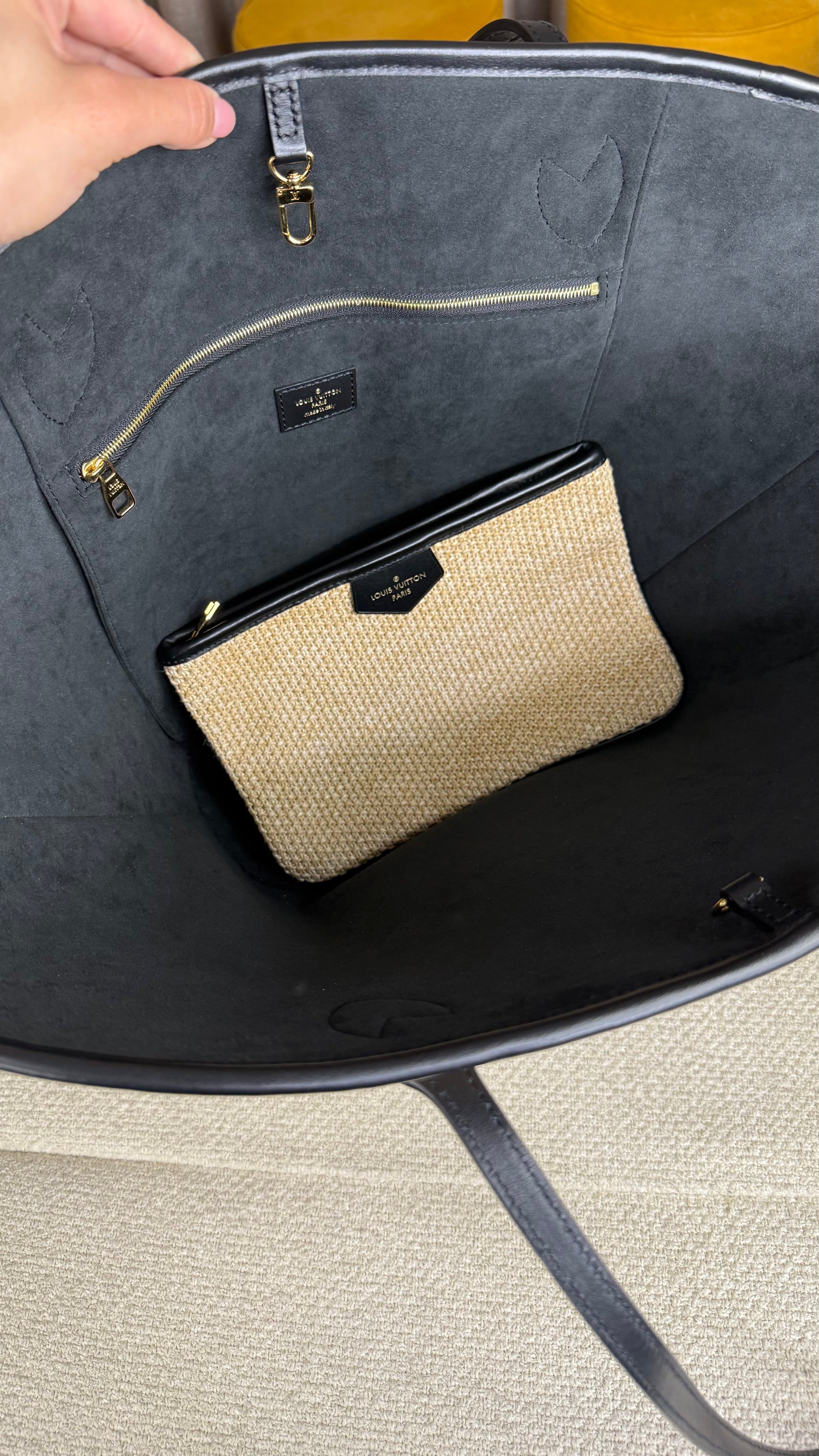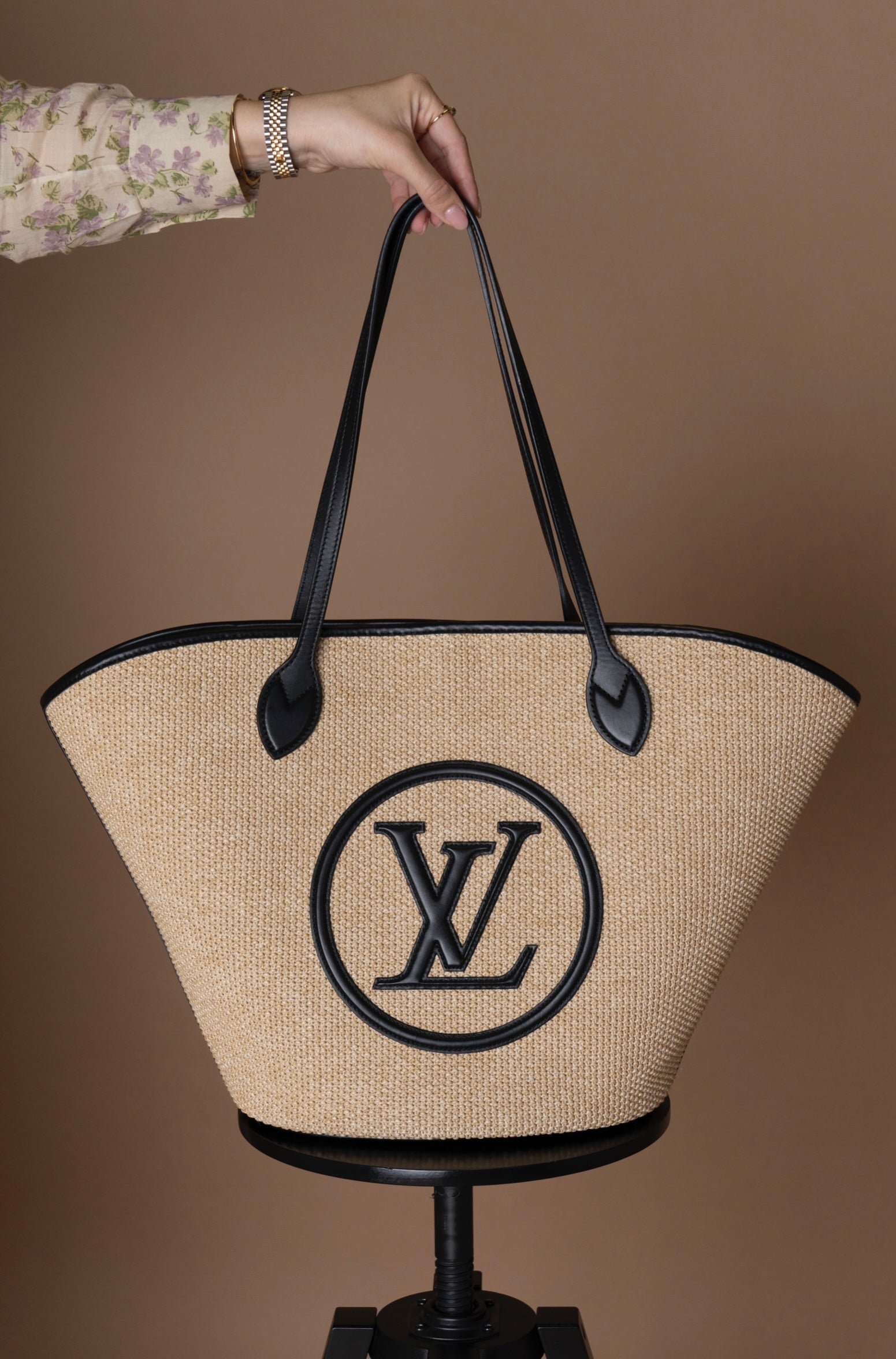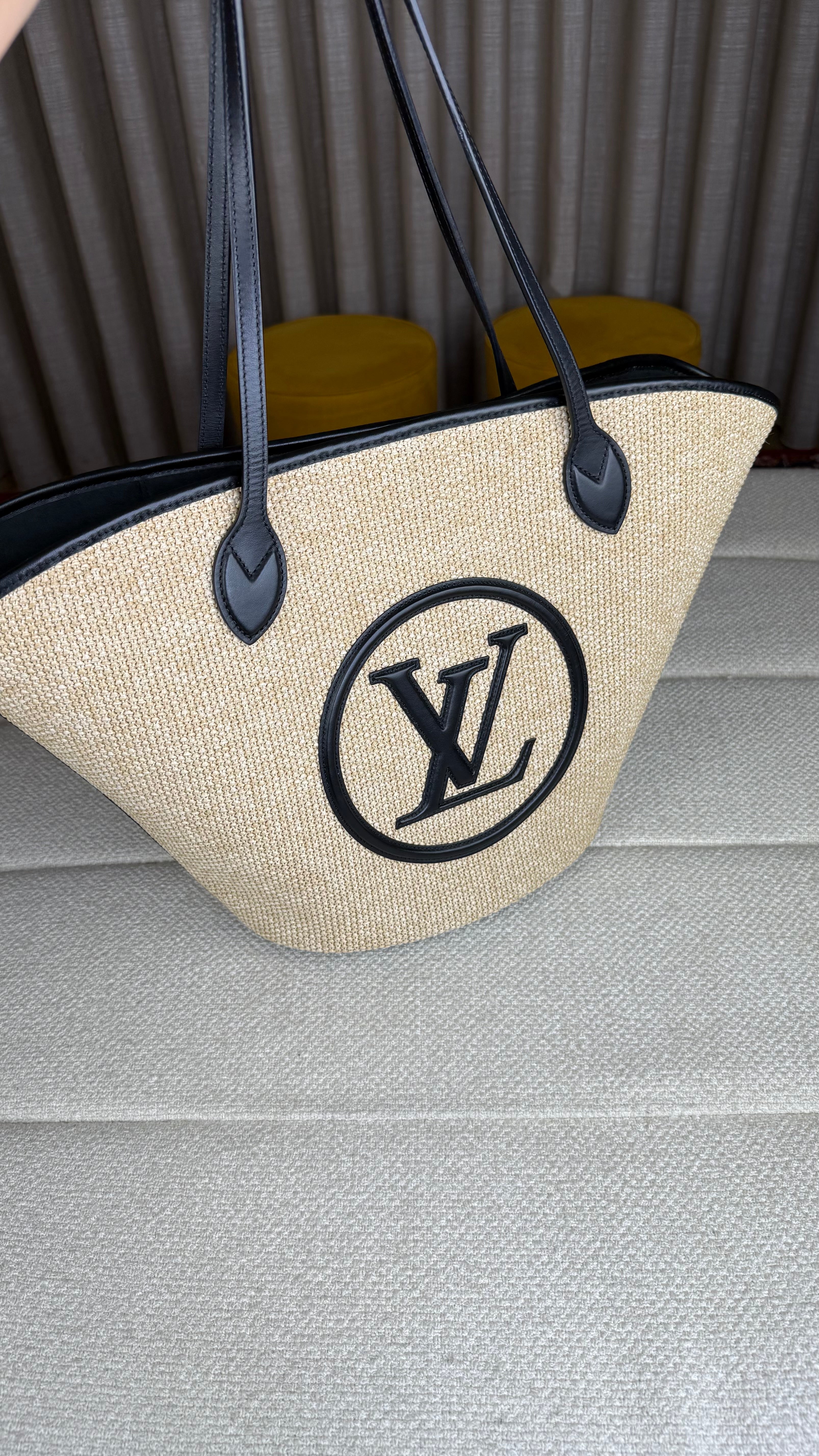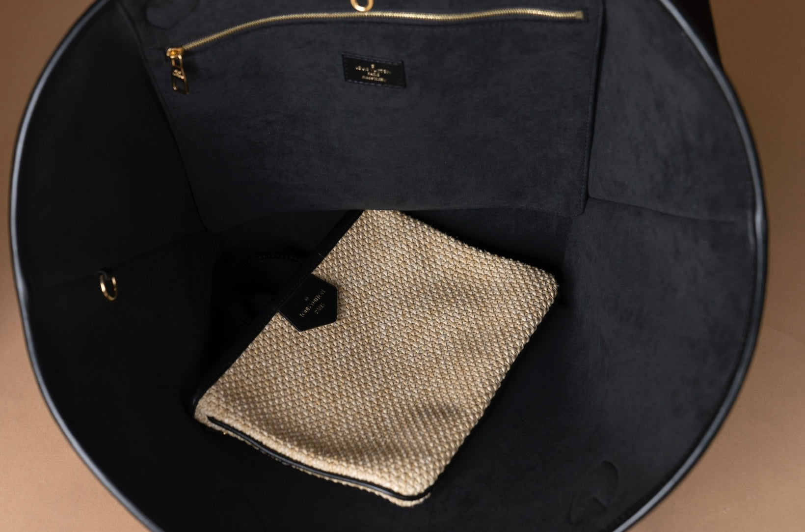 A Louis Vuitton Saint Jacques Raffia Tote é uma bolsa de grandes dimensões, ideal para o verão, que combina o icónico design de cabas da maison com materiais naturais e acabamento artesanal. Confeccionada em raffia sintética trançada, possui detalhes em couro bovino natural nos acabamentos e ferragens em metal dourado que contrastam com o corpo texturizado. O interior aberto em microsuede acolhe uma pochette de raffia removível, permitindo organização extra ou uso como clutch.