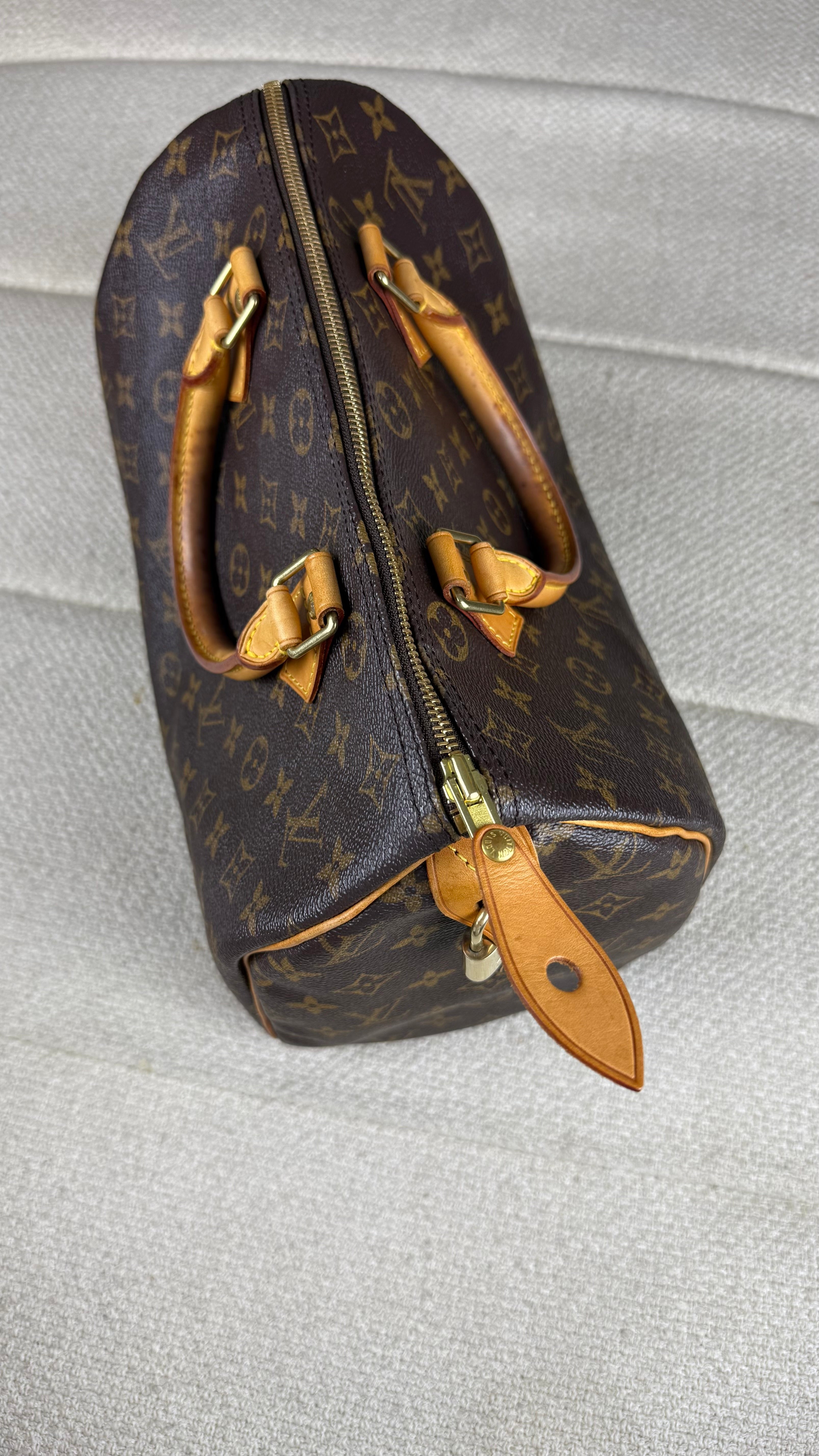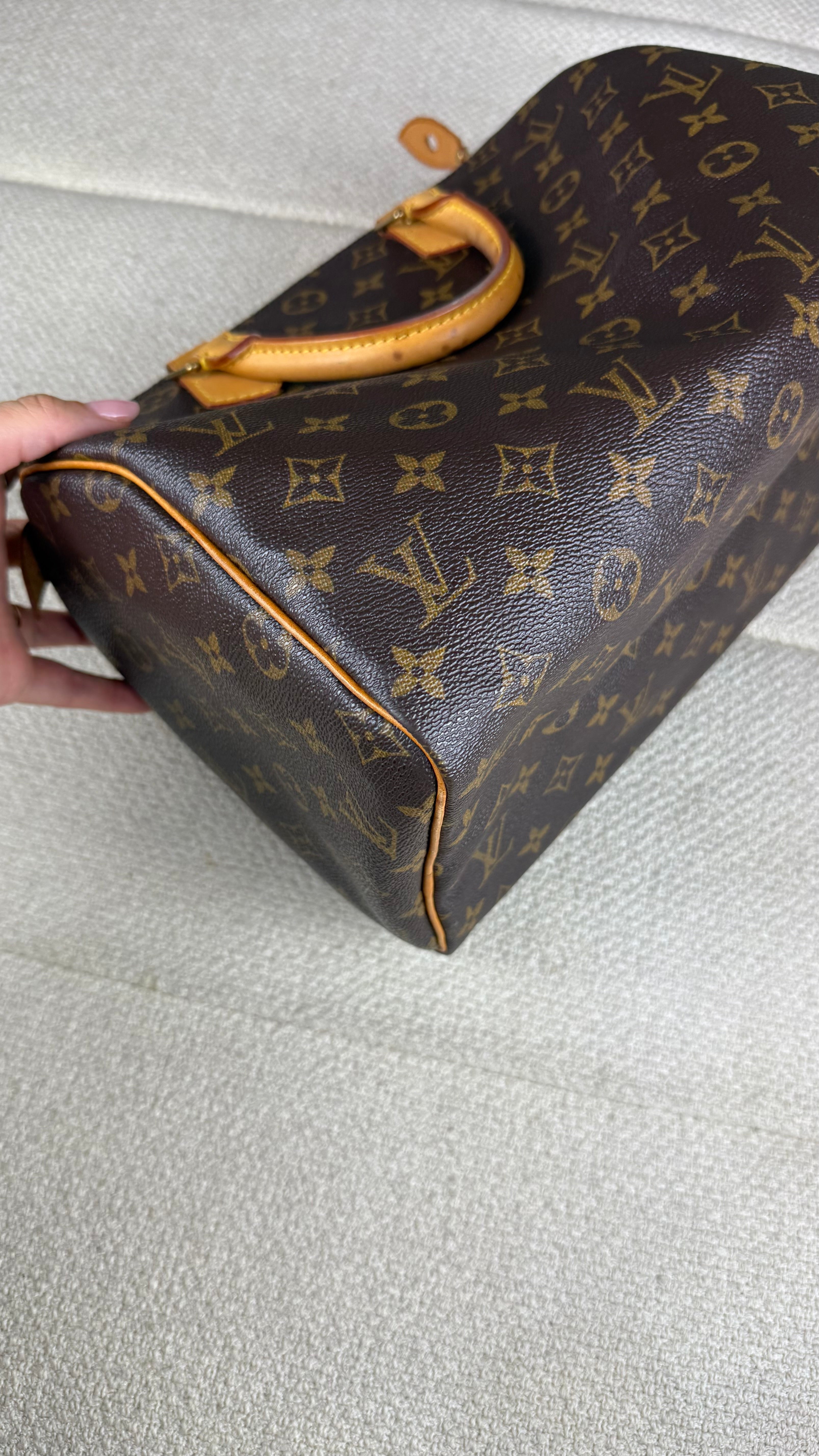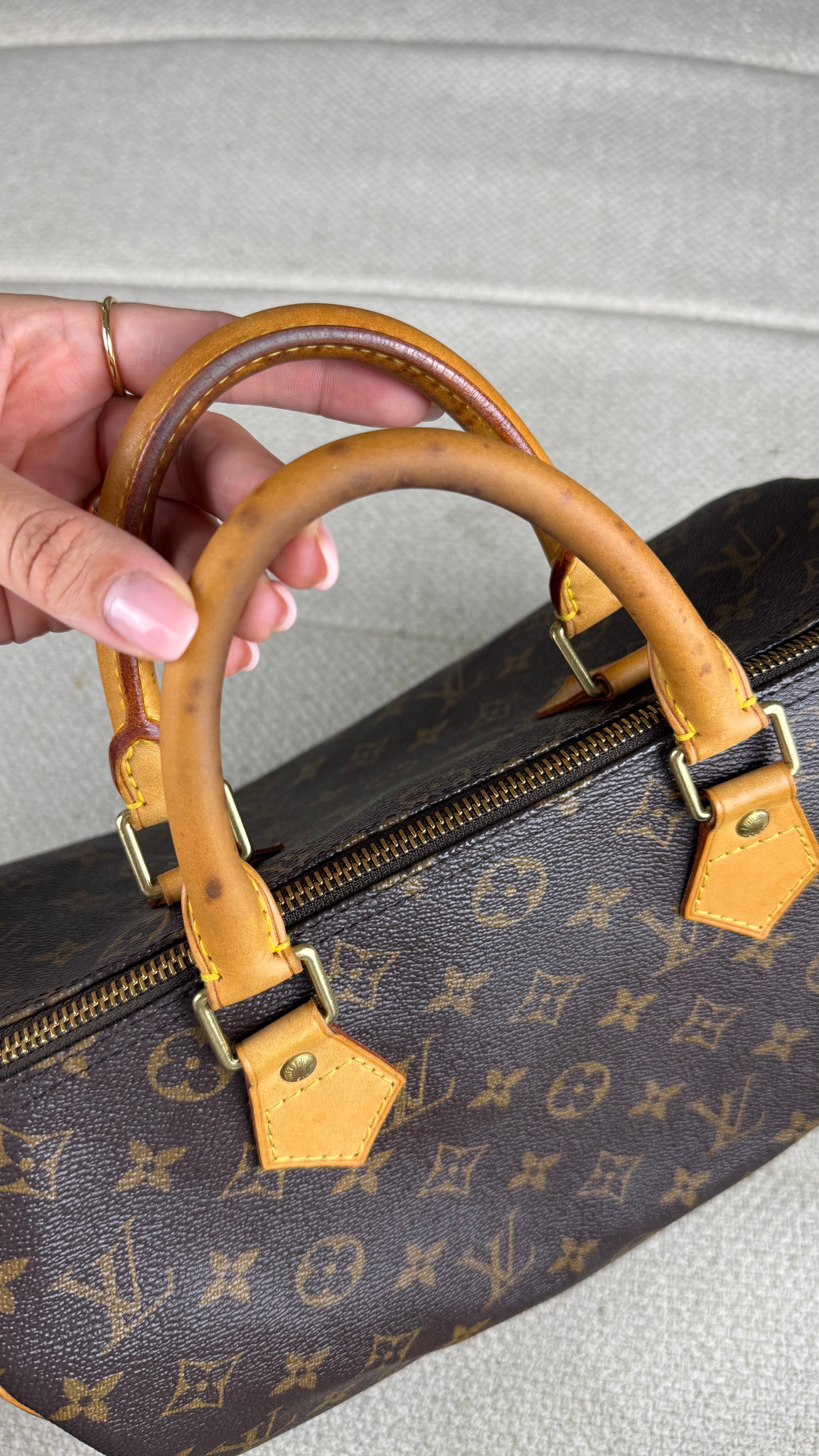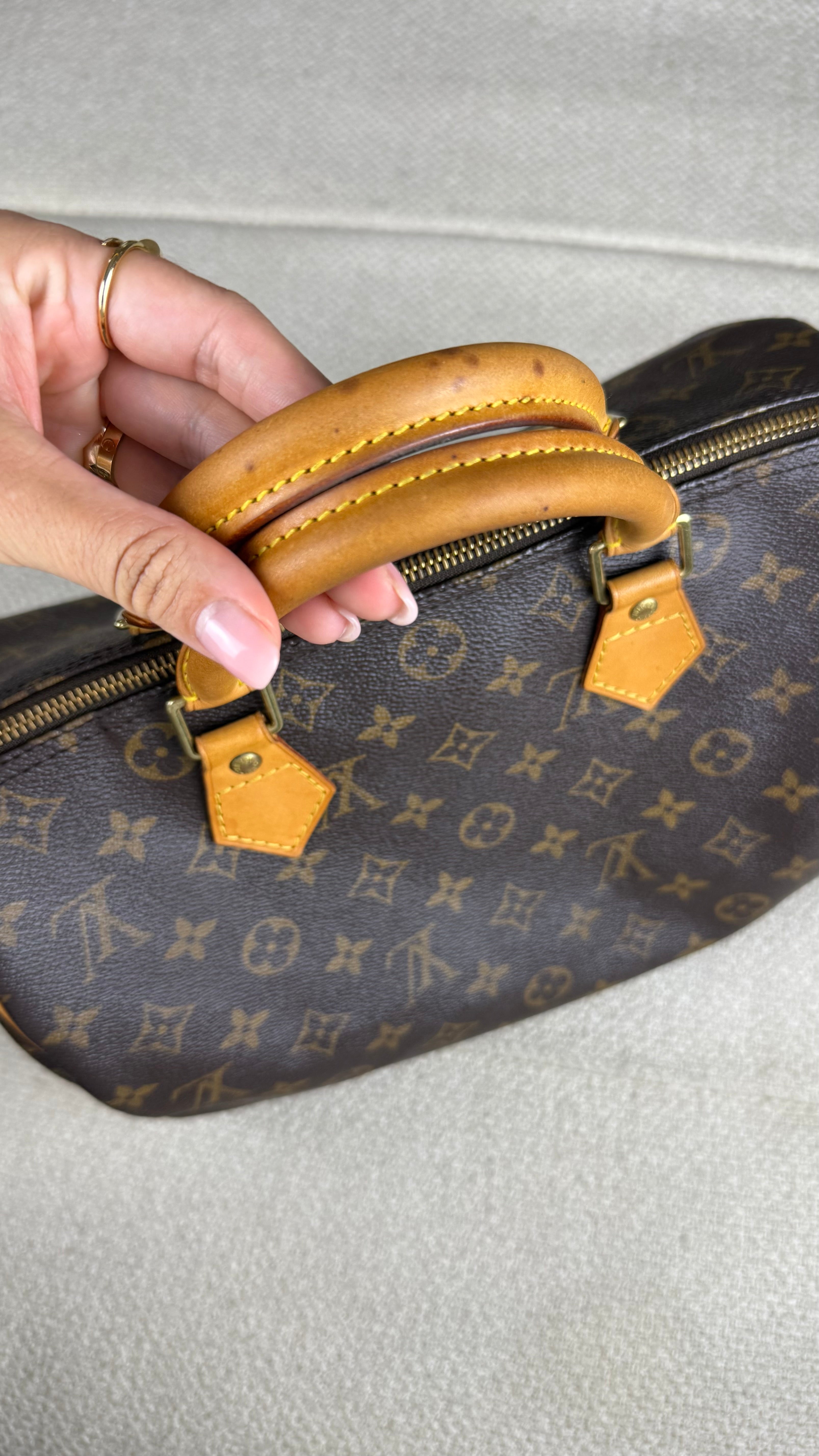 A Speedy 30 é um verdadeiro clássico da Louis Vuitton, símbolo de elegância atemporal e praticidade. Na versão vintage com canvas Monogram, a bolsa traz o charme único das peças com história, unindo tradição e estilo icônico da maison francesa.