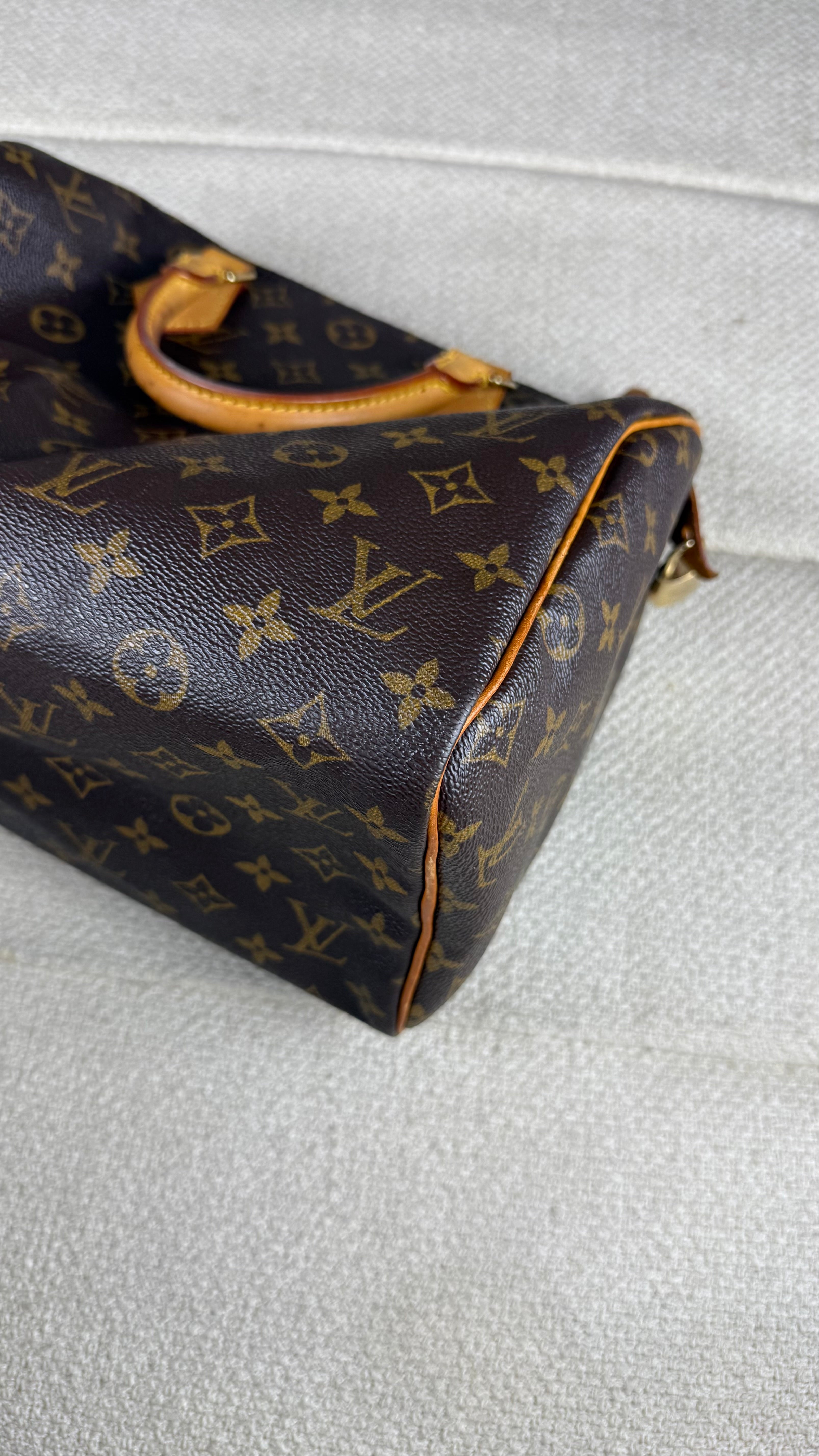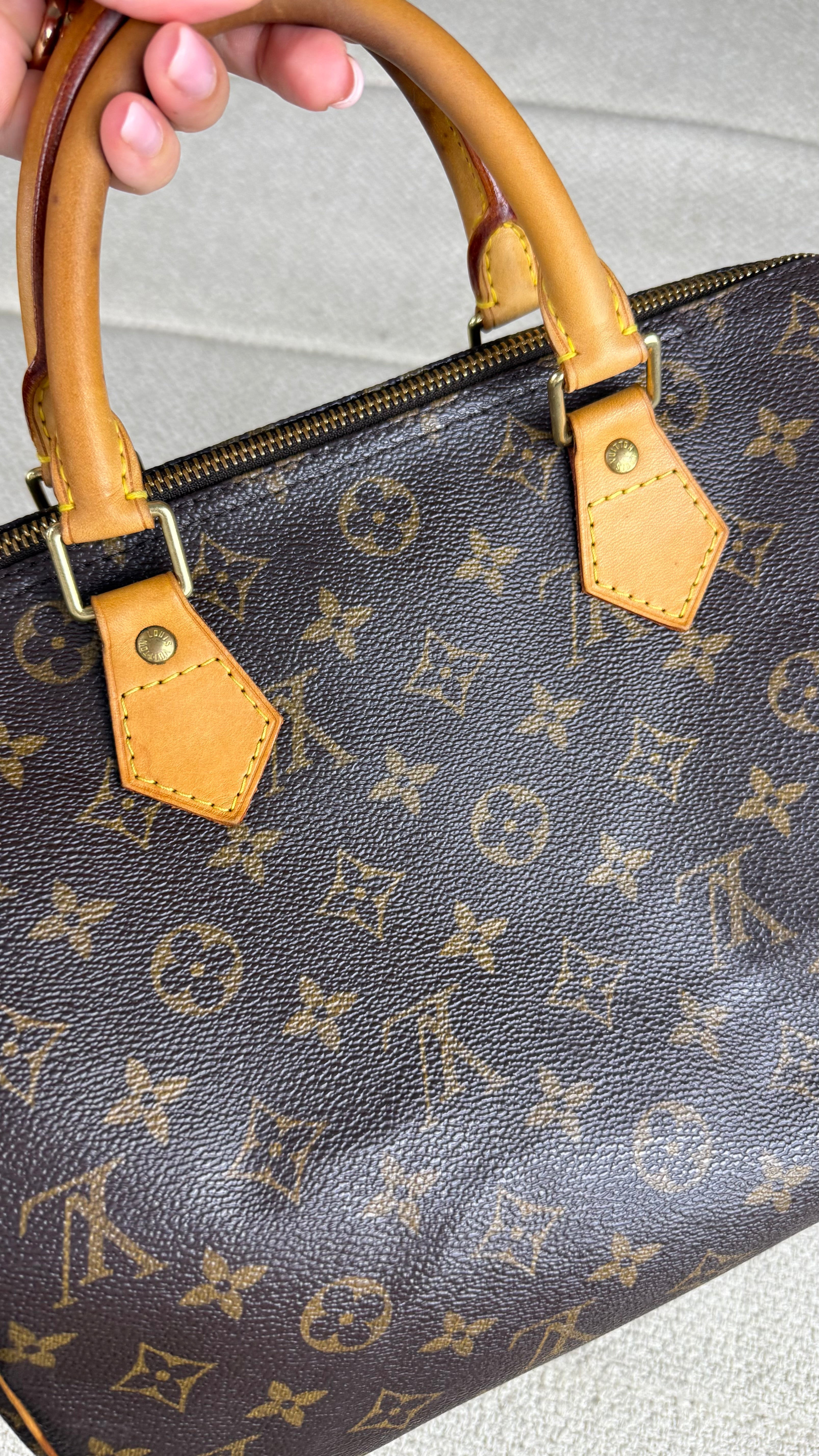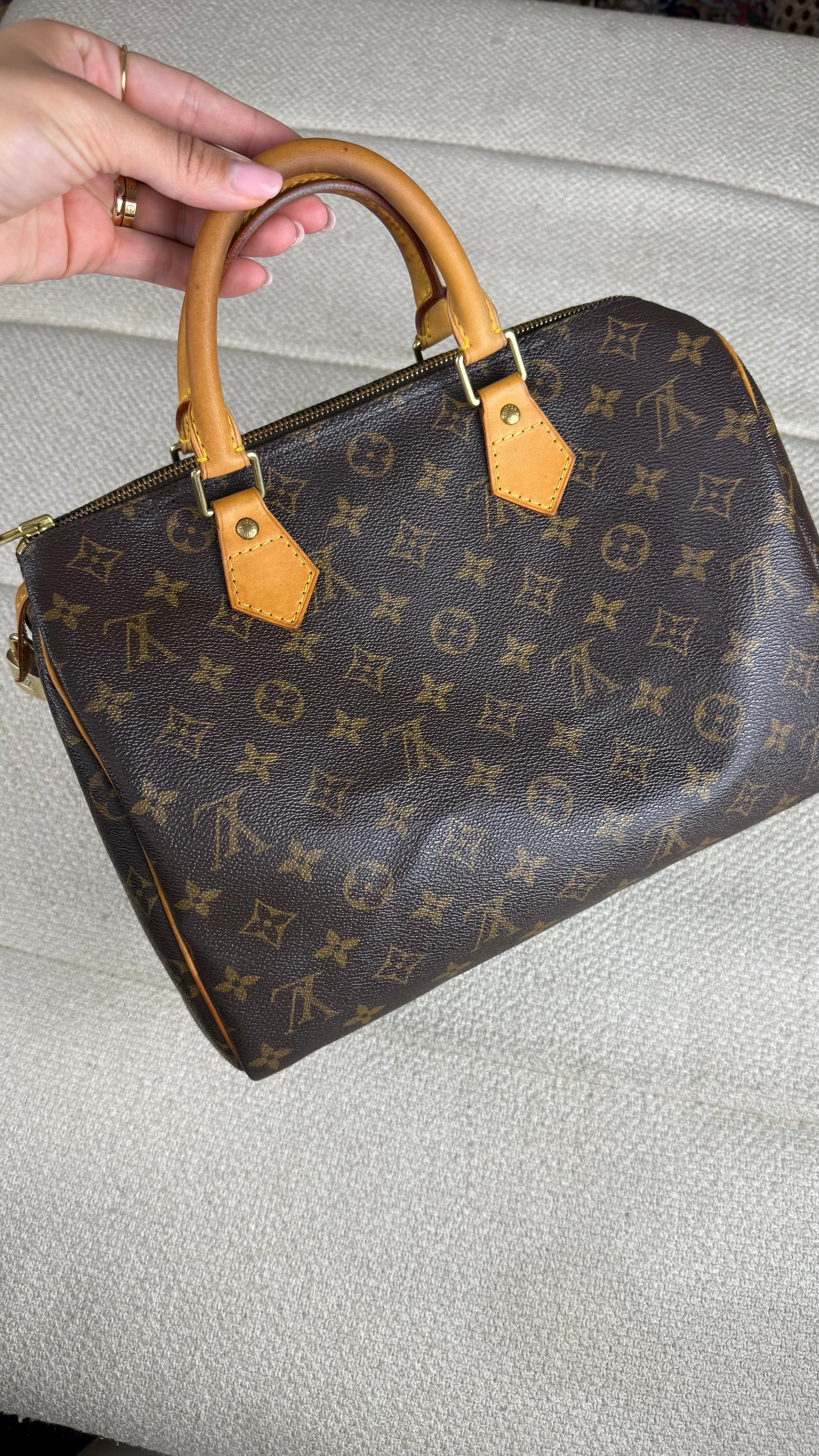 A Speedy 30 é um verdadeiro clássico da Louis Vuitton, símbolo de elegância atemporal e praticidade. Na versão vintage com canvas Monogram, a bolsa traz o charme único das peças com história, unindo tradição e estilo icônico da maison francesa.