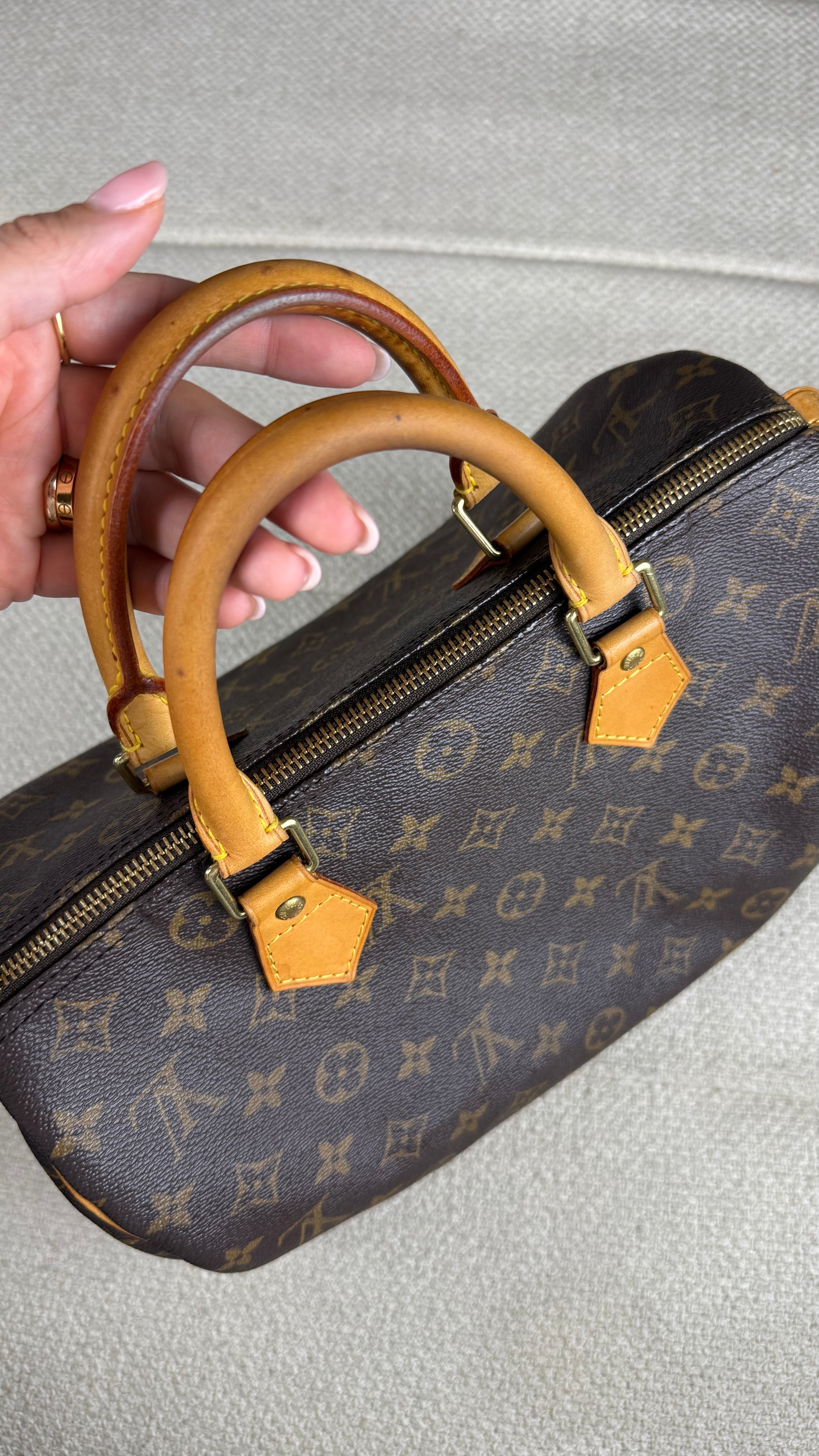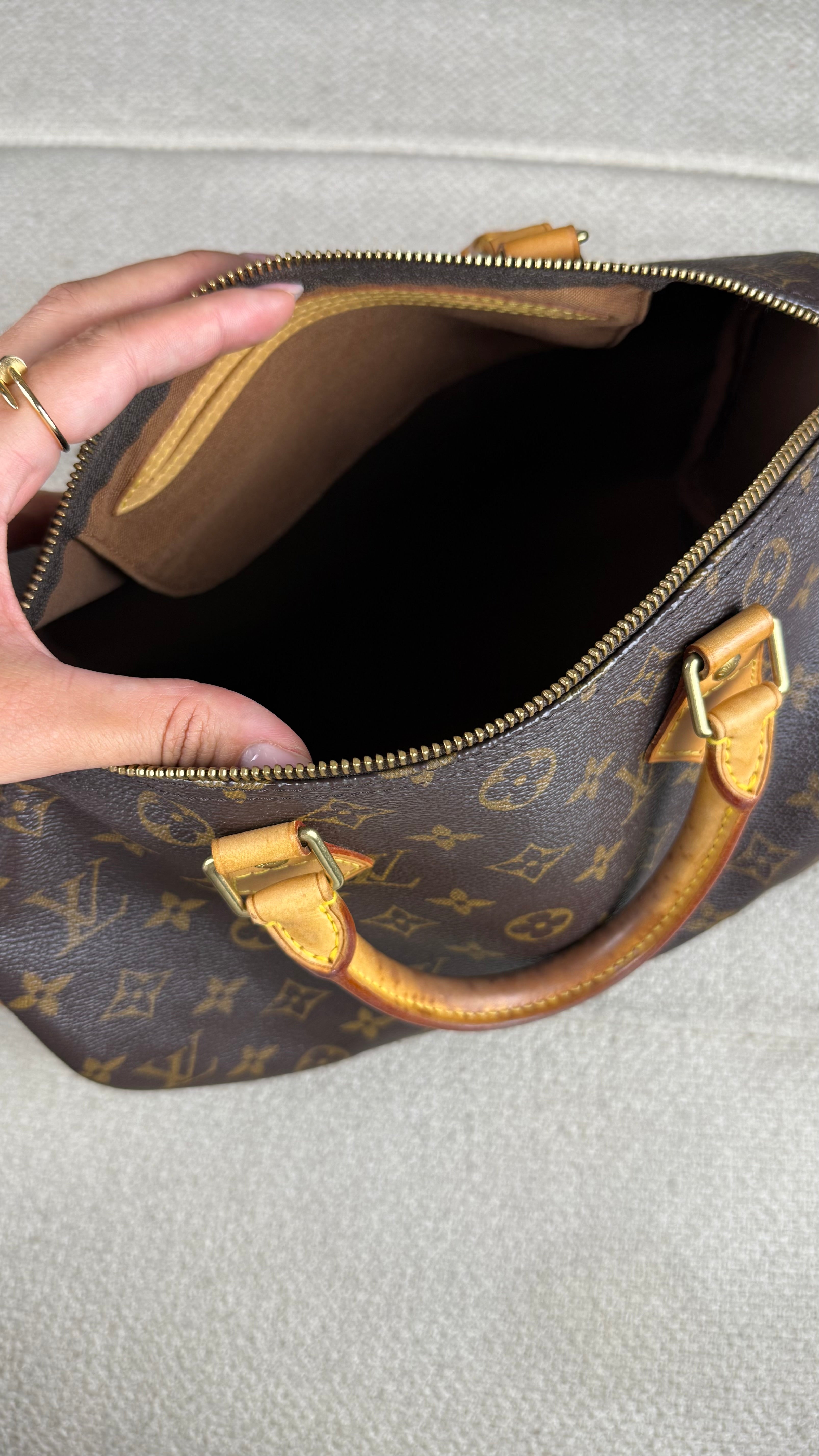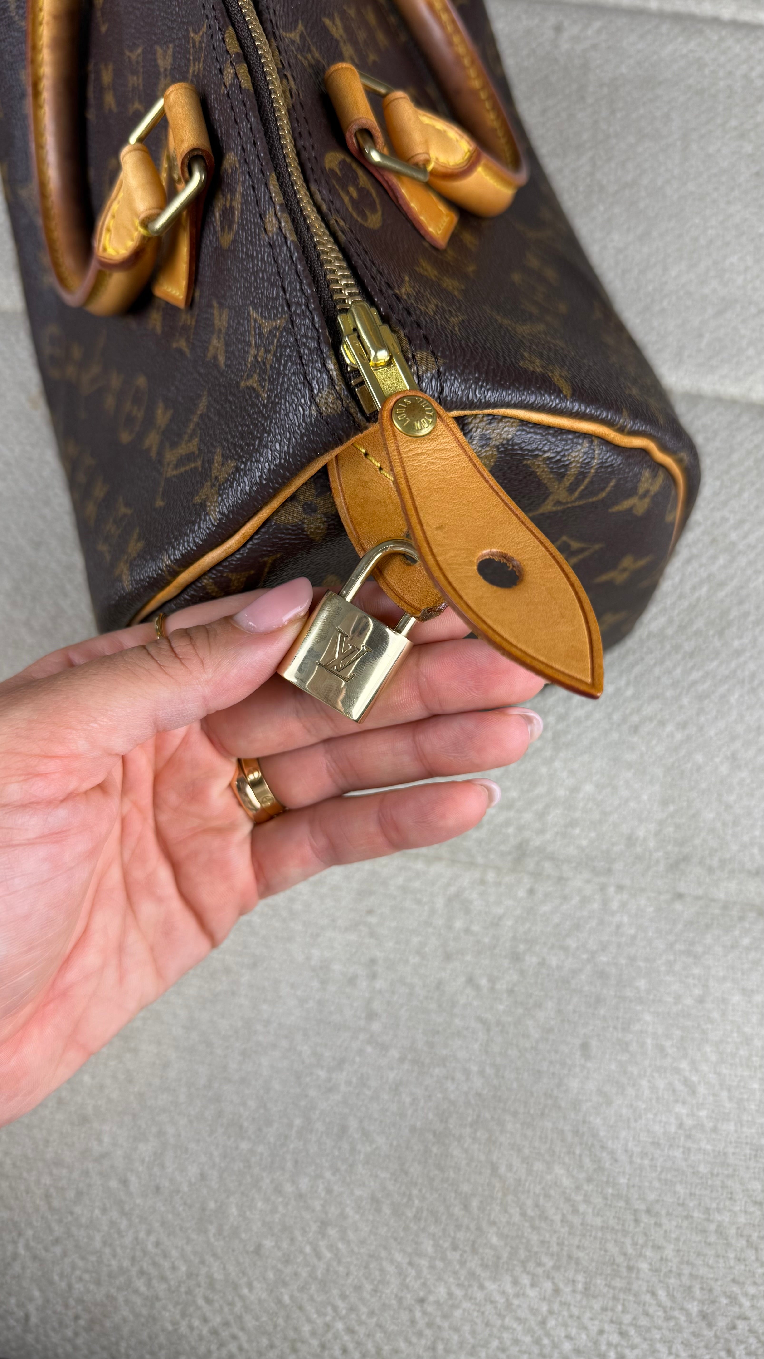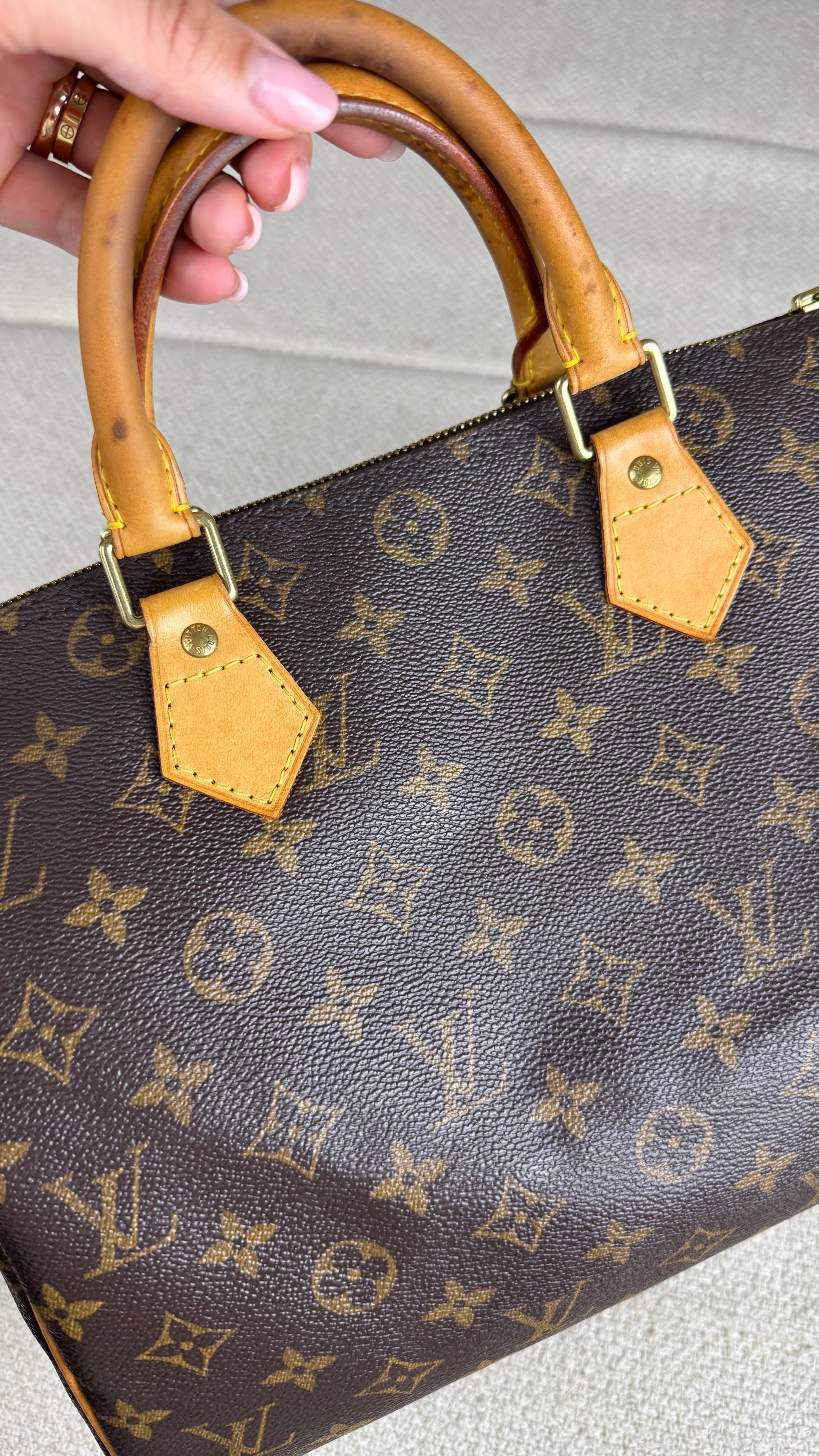 A Speedy 30 é um verdadeiro clássico da Louis Vuitton, símbolo de elegância atemporal e praticidade. Na versão vintage com canvas Monogram, a bolsa traz o charme único das peças com história, unindo tradição e estilo icônico da maison francesa.