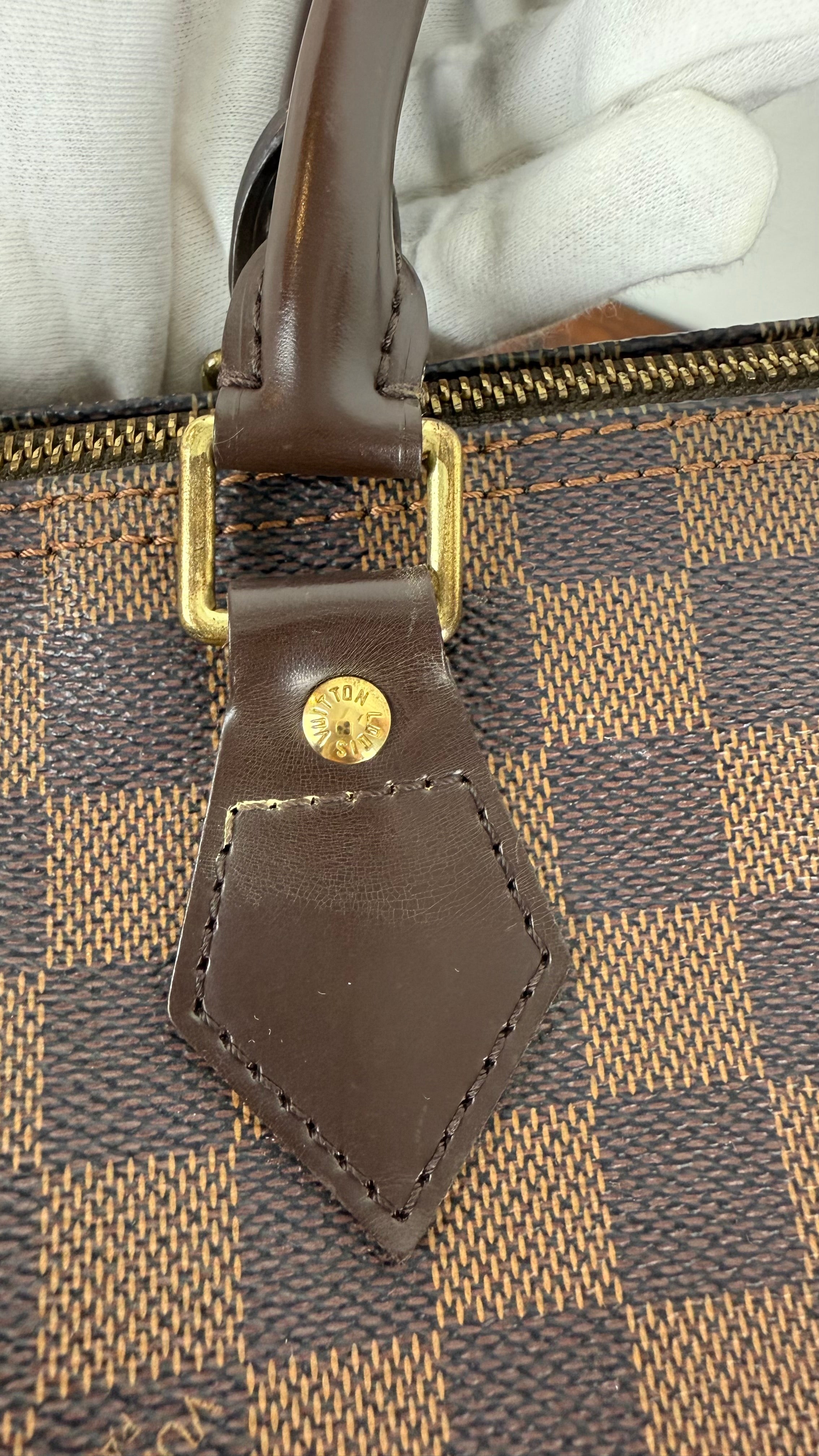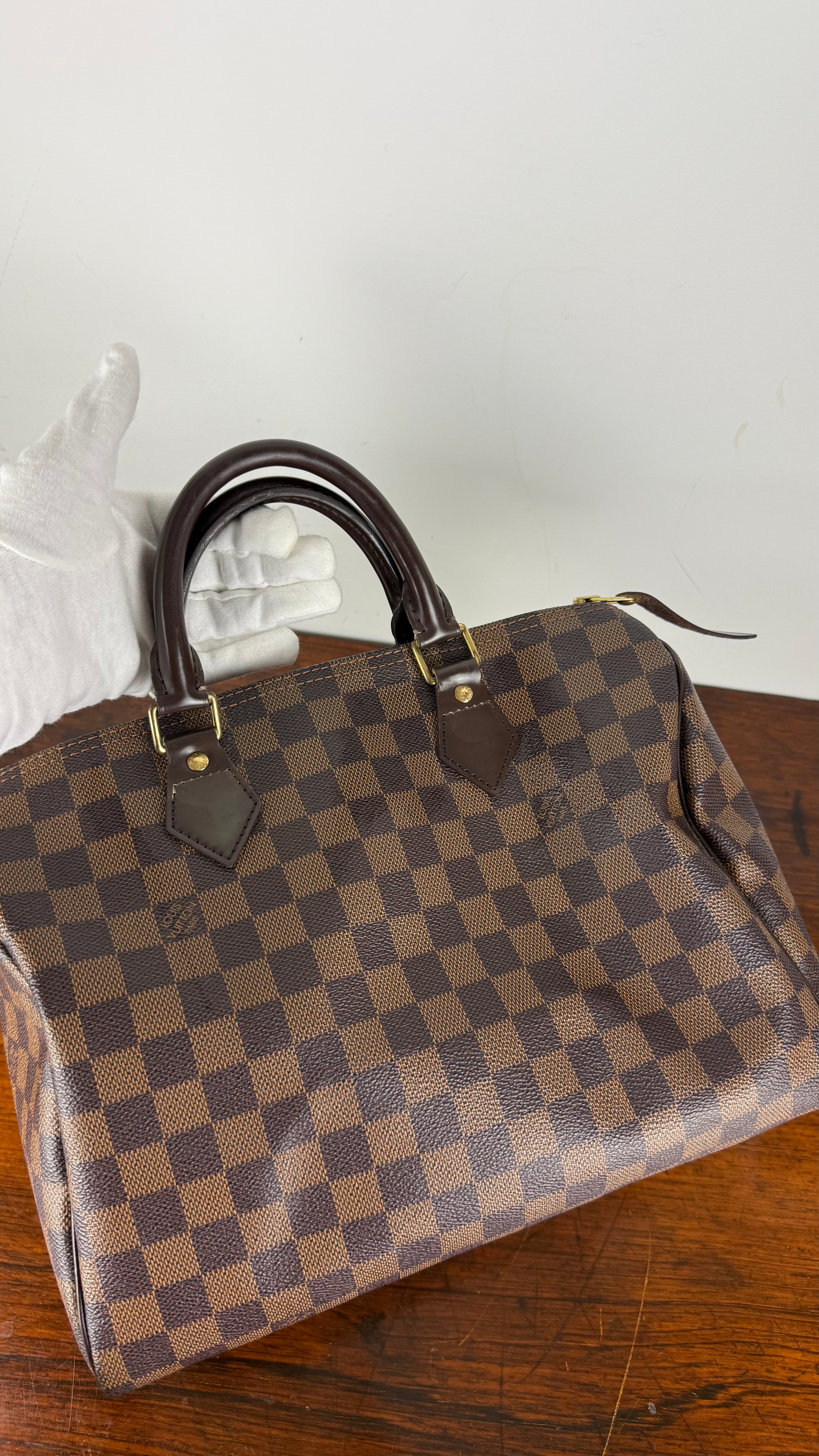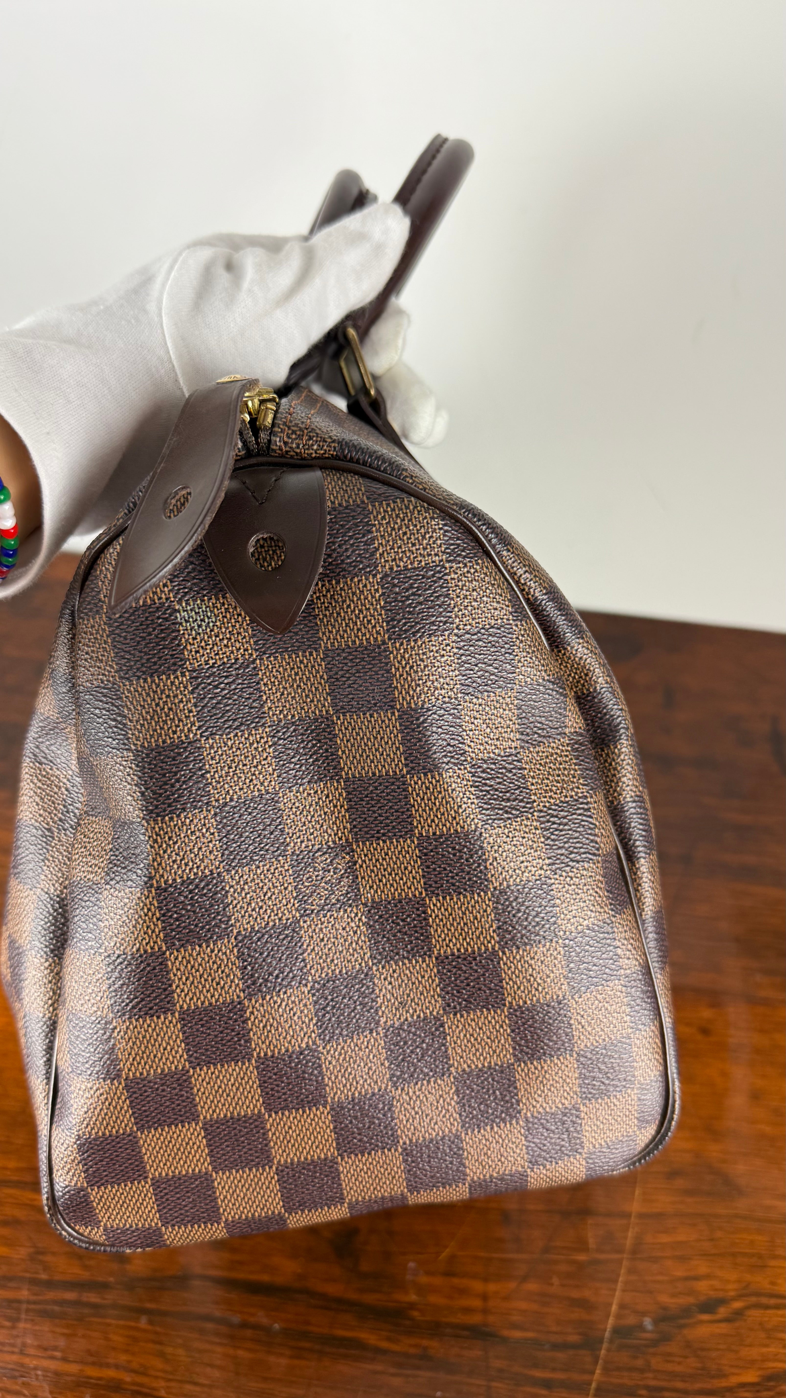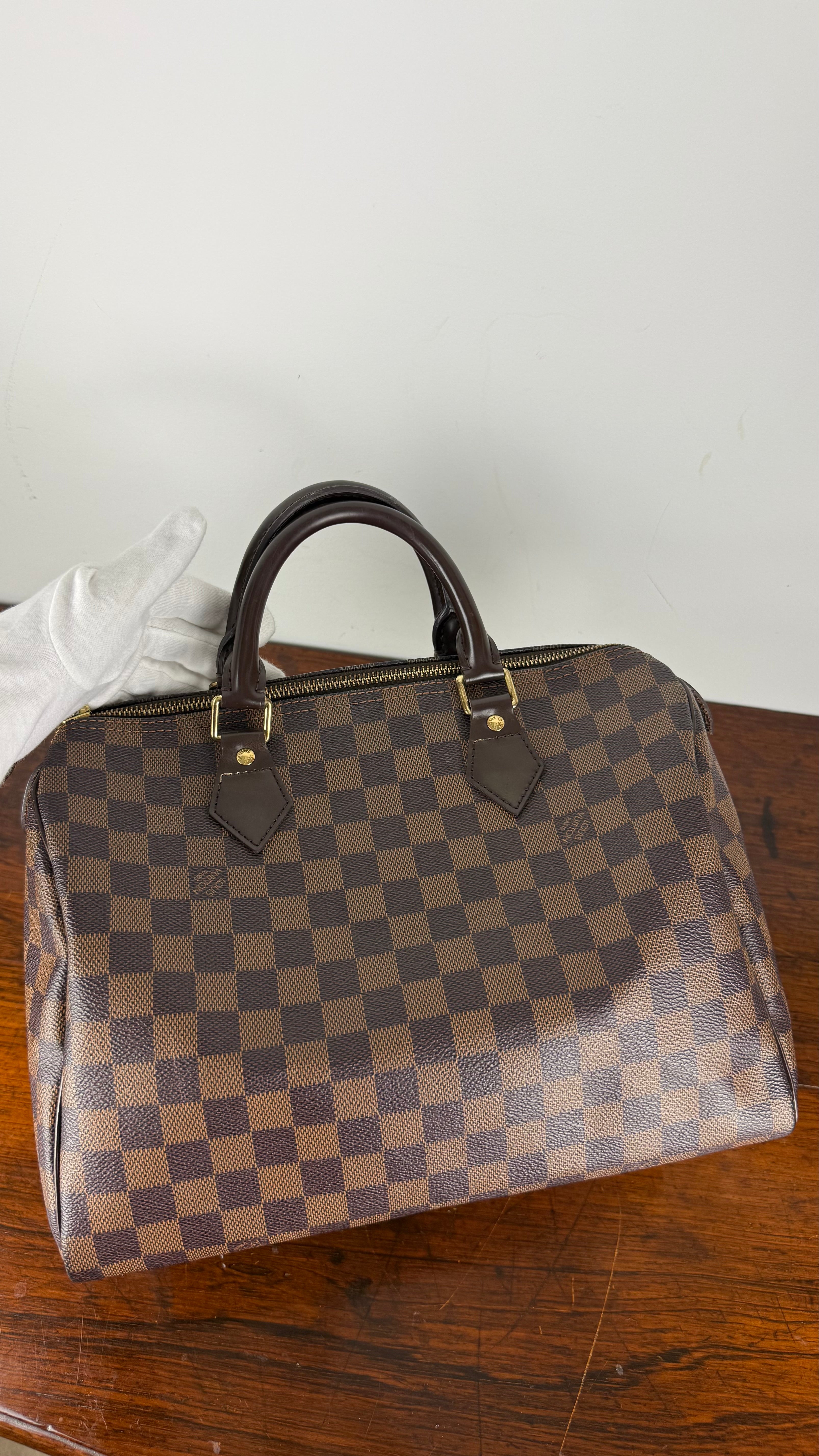 Louis Vuitton Speedy 30 Damier EbeneÍcone da Louis Vuitton, a Speedy 30 na clássica estampa DamierEbene é a perfeita combinação entre praticidade e elegância. Feita em lona canvas resistente e detalhes em couro marrom escuro, essa bolsa é ideal para o dia a dia, trazendo um toque atemporal de sofisticação. Seu tamanho espaçoso acomoda tudo o que você precisa, enquanto o design leve e a alça de mão estruturada garantem conforto e estilo em qualquer ocasião.
