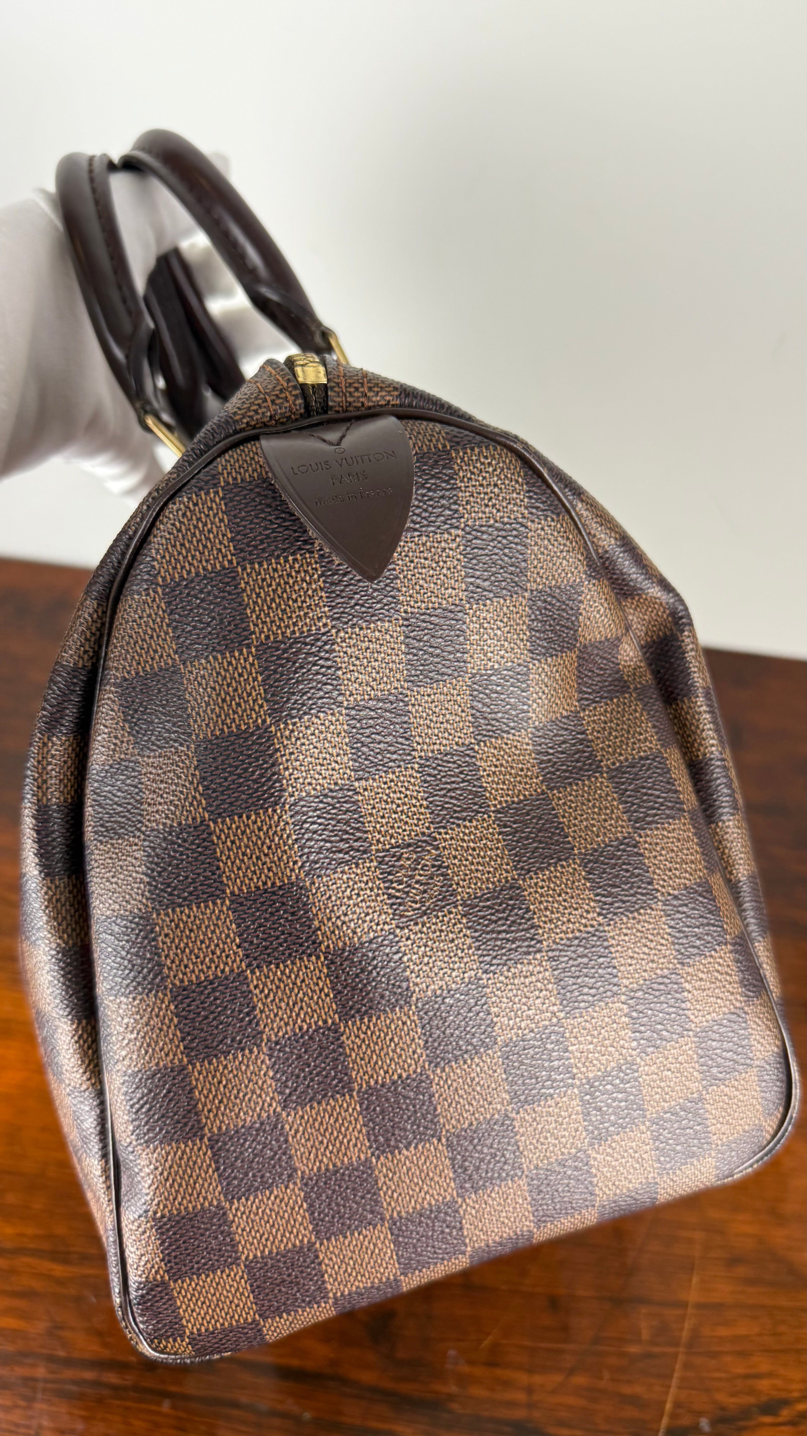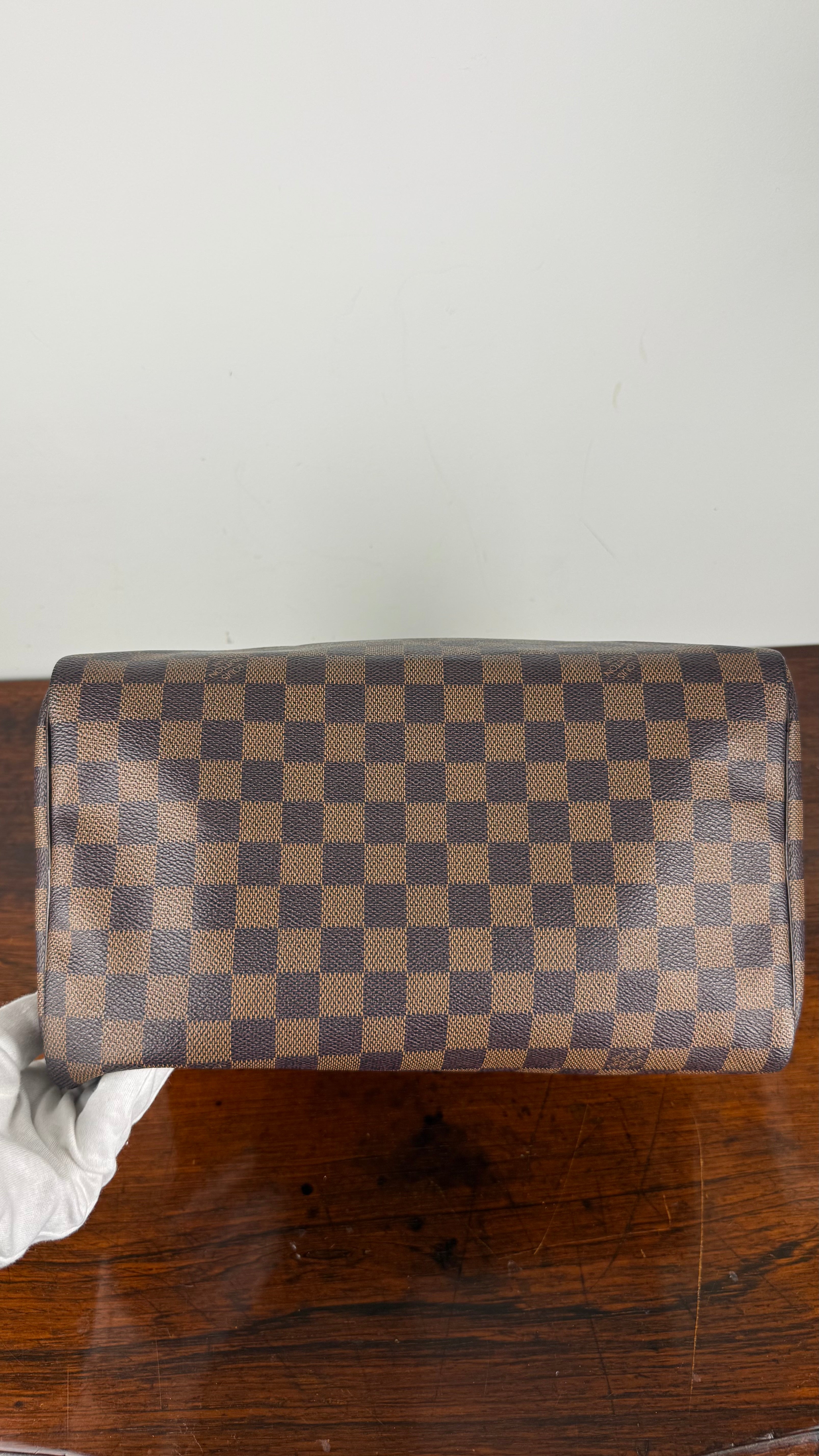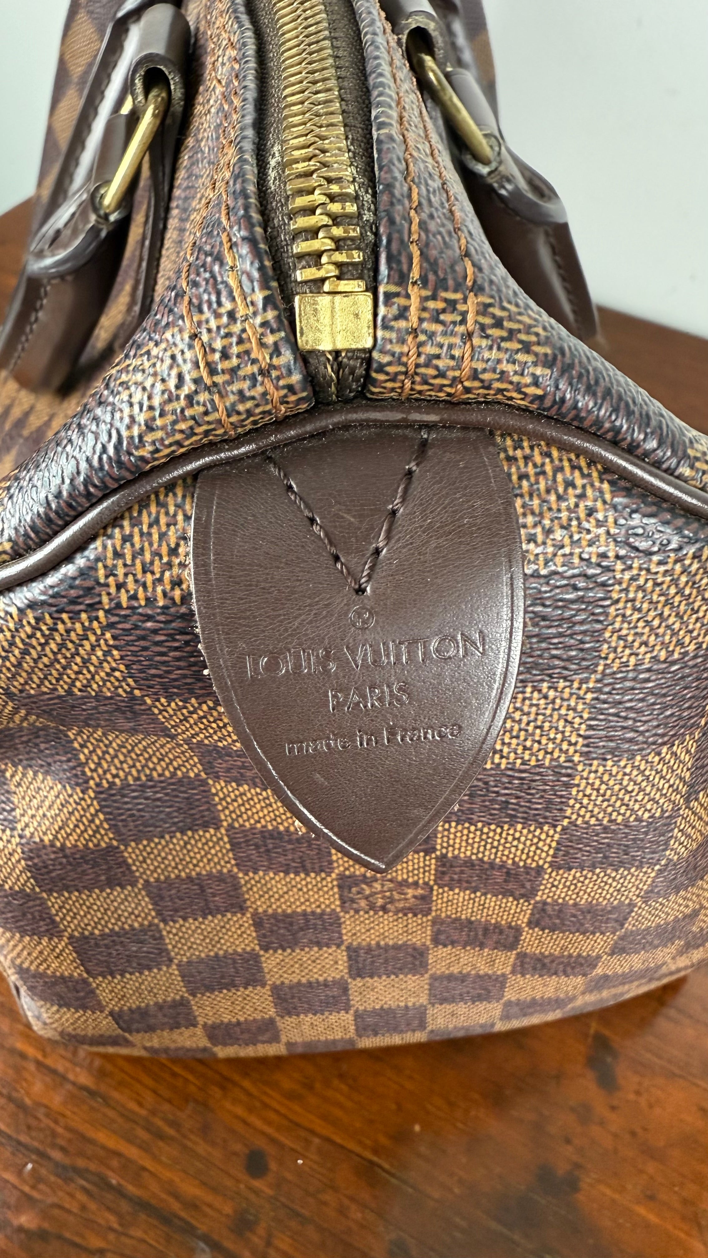 Louis Vuitton Speedy 30 Damier EbeneÍcone da Louis Vuitton, a Speedy 30 na clássica estampa DamierEbene é a perfeita combinação entre praticidade e elegância. Feita em lona canvas resistente e detalhes em couro marrom escuro, essa bolsa é ideal para o dia a dia, trazendo um toque atemporal de sofisticação. Seu tamanho espaçoso acomoda tudo o que você precisa, enquanto o design leve e a alça de mão estruturada garantem conforto e estilo em qualquer ocasião.