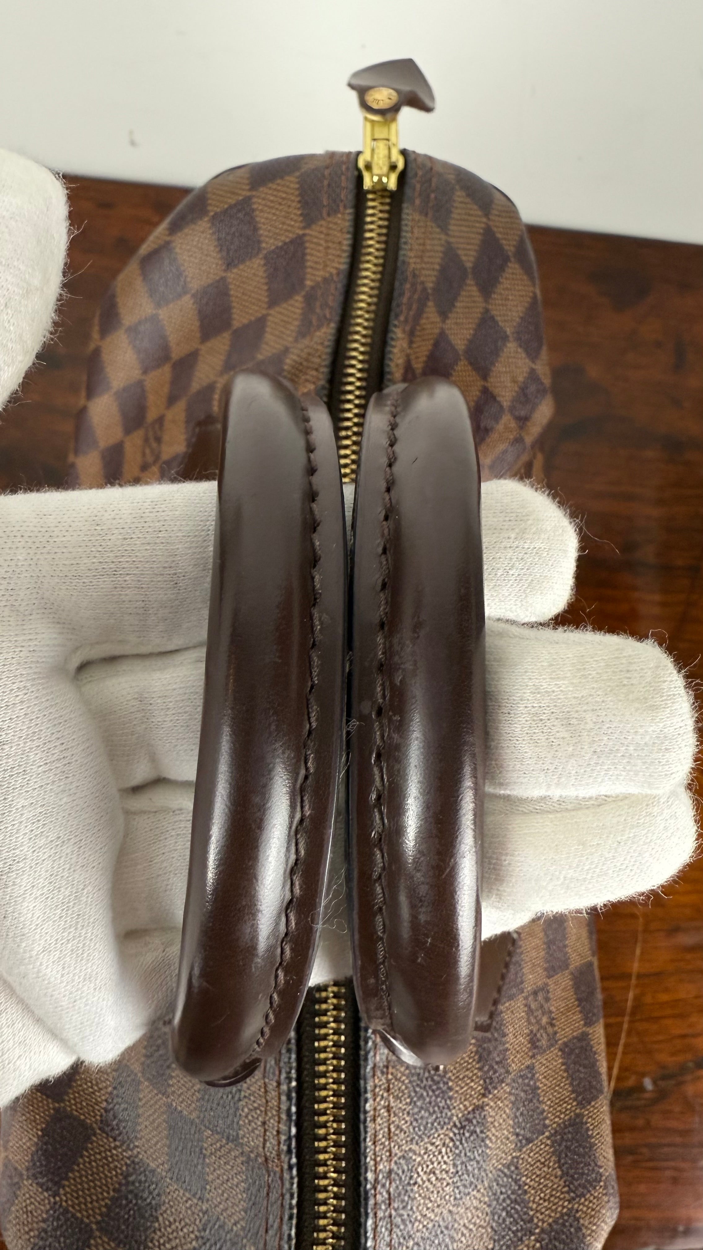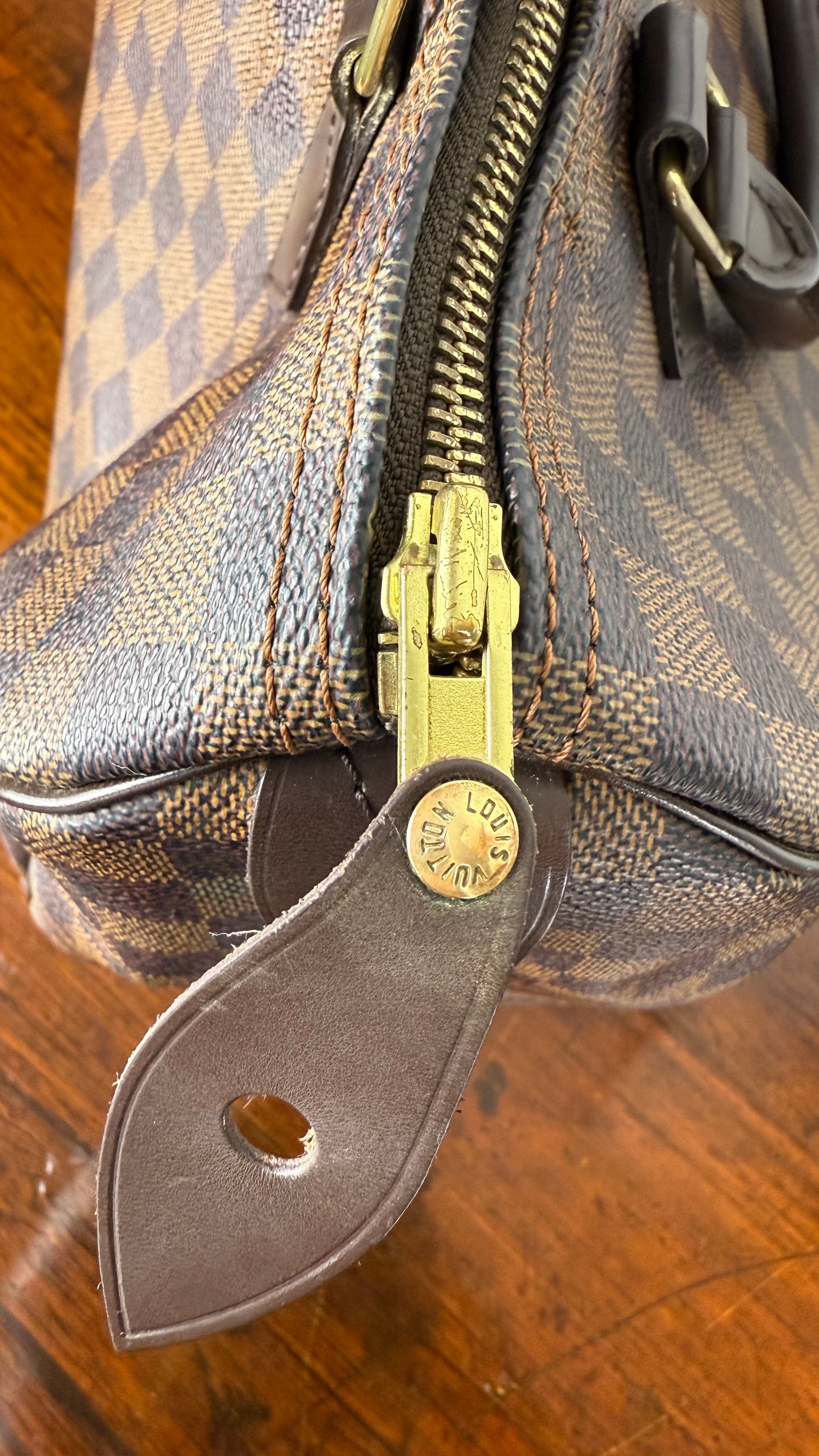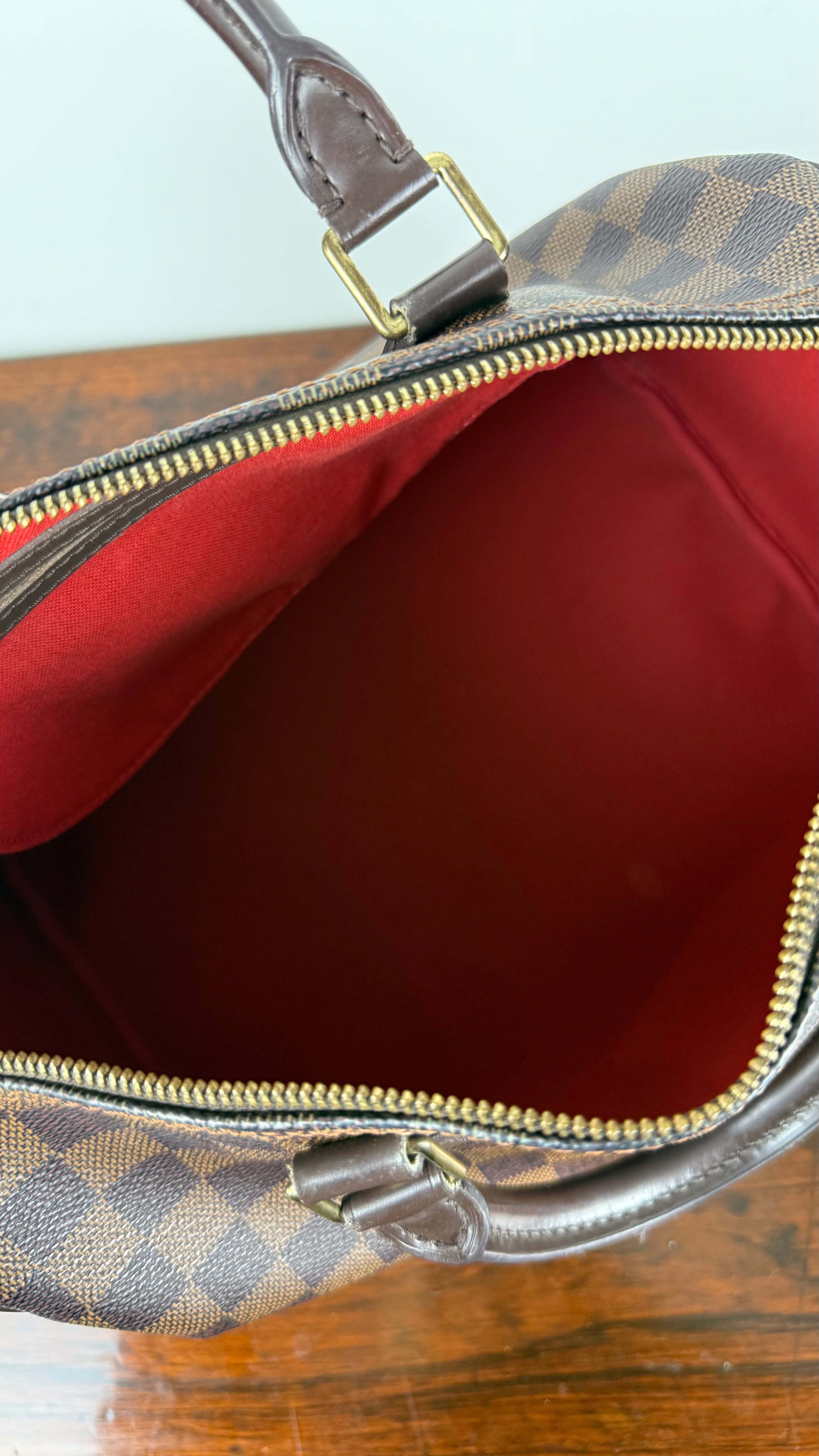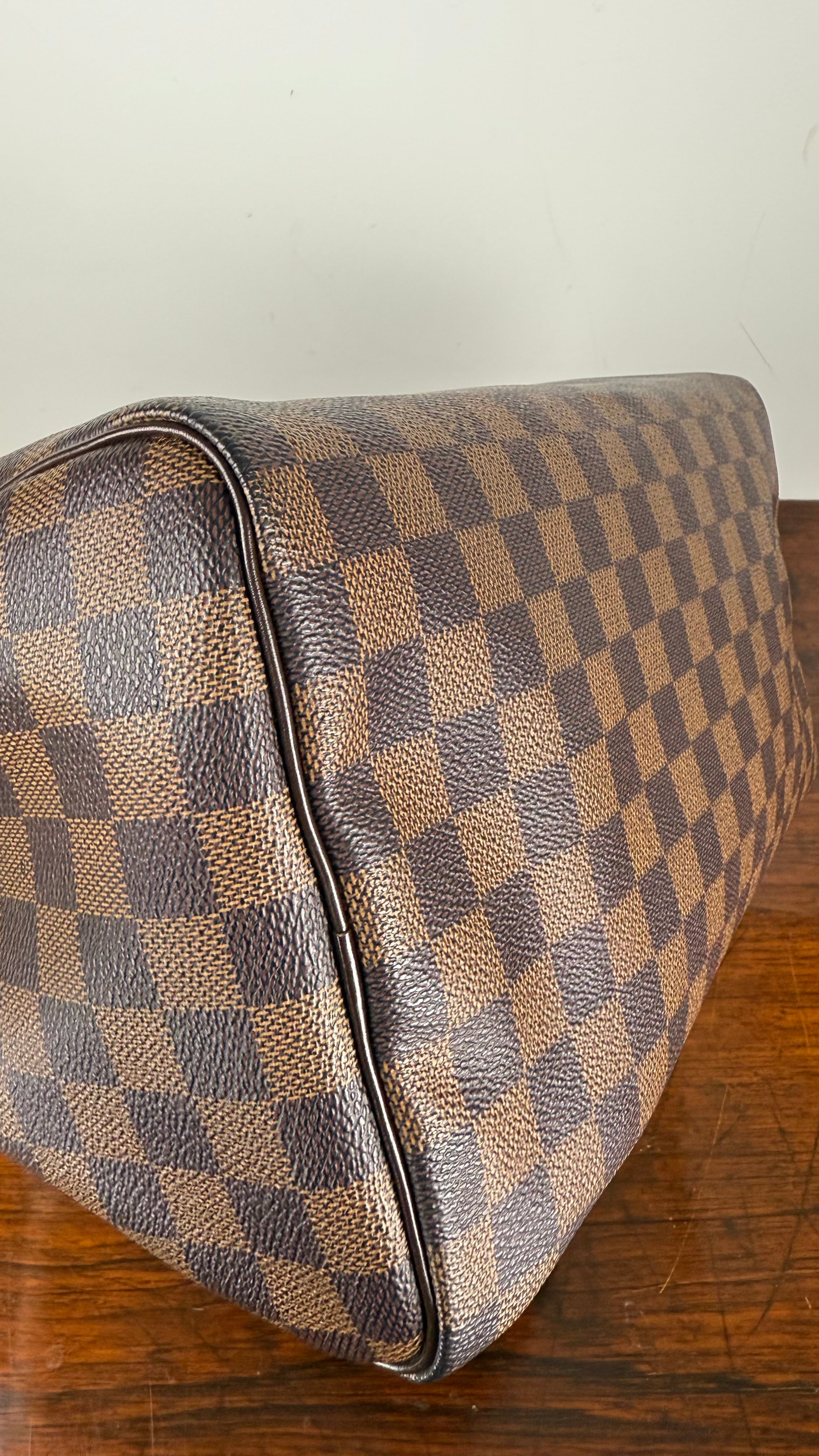Louis Vuitton Speedy 30 Damier EbeneÍcone da Louis Vuitton, a Speedy 30 na clássica estampa DamierEbene é a perfeita combinação entre praticidade e elegância. Feita em lona canvas resistente e detalhes em couro marrom escuro, essa bolsa é ideal para o dia a dia, trazendo um toque atemporal de sofisticação. Seu tamanho espaçoso acomoda tudo o que você precisa, enquanto o design leve e a alça de mão estruturada garantem conforto e estilo em qualquer ocasião.