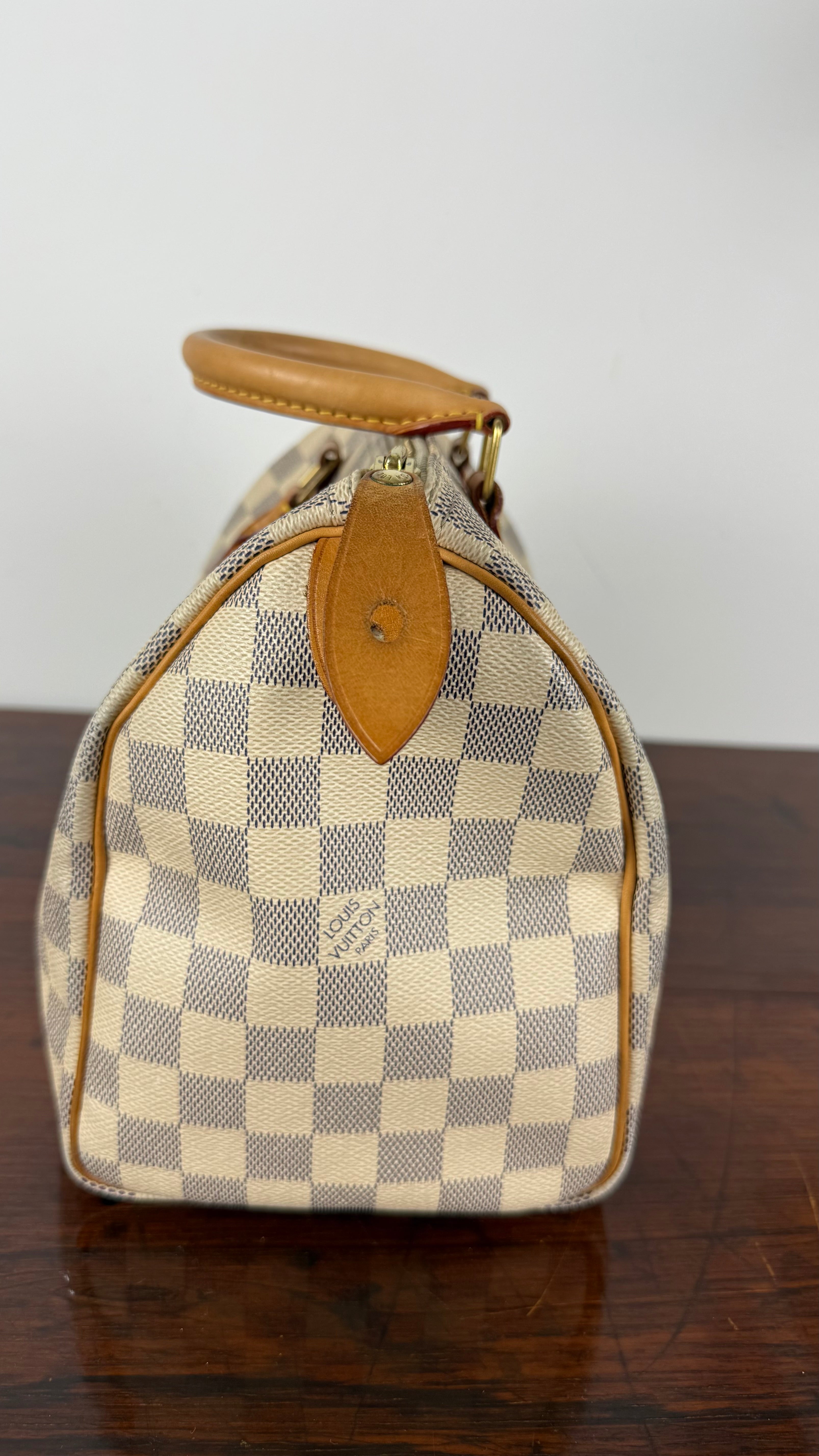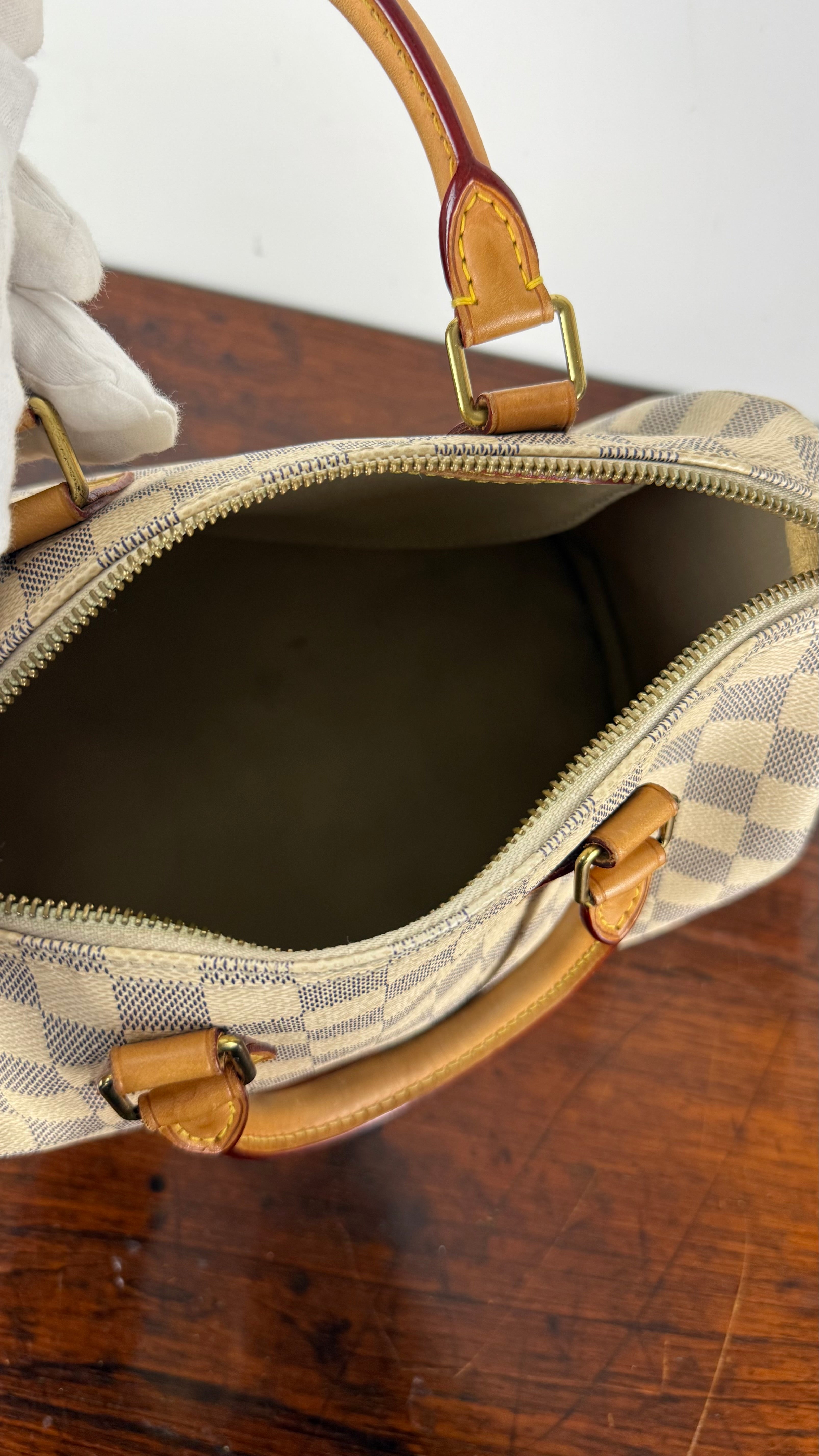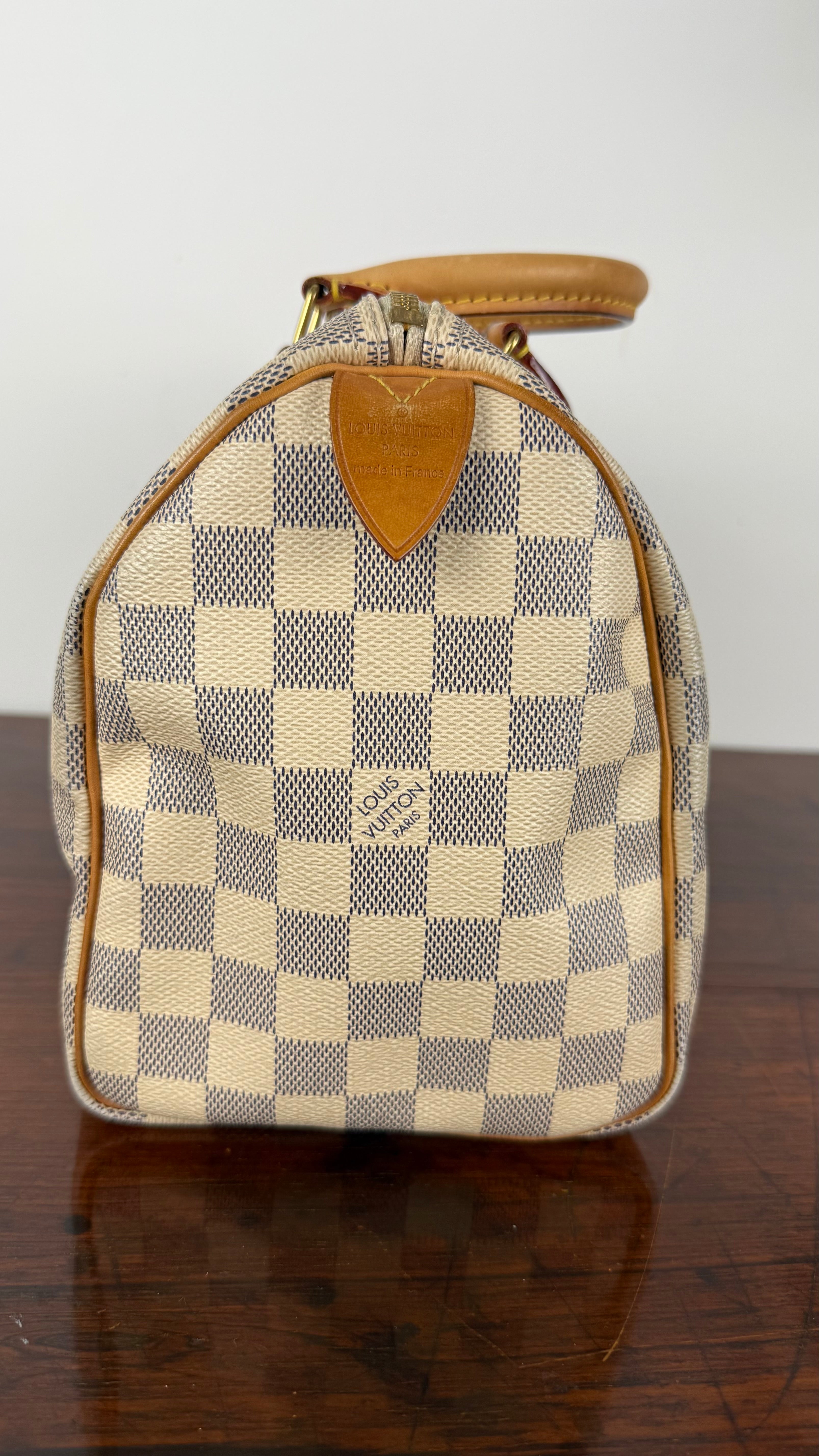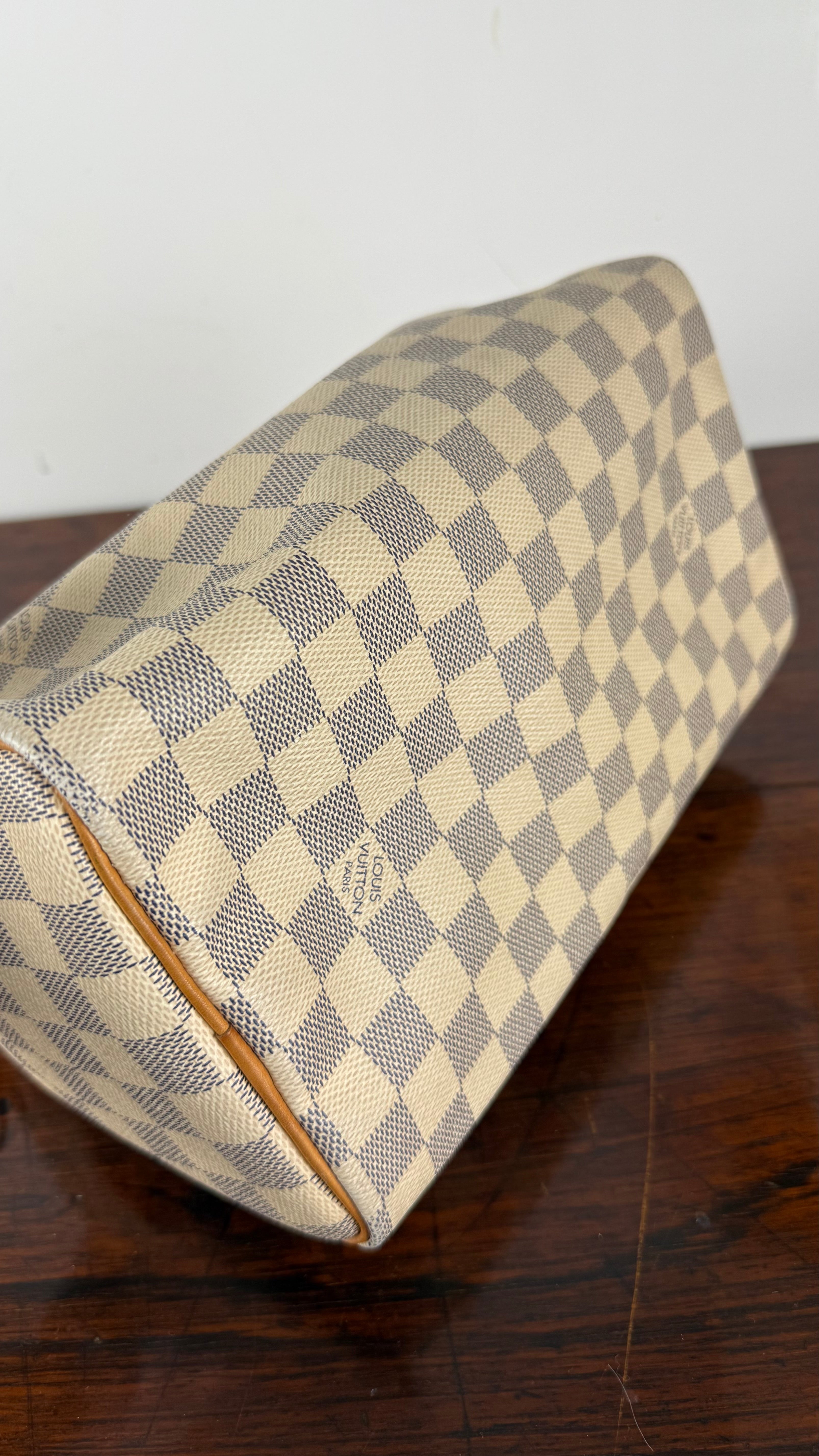 A Louis Vuitton Speedy 25 em canvas Damier Azur é uma versão elegante e refrescante da icônica bolsa Speedy, ideal para quem busca uma peça clássica com um toque de leveza e sofisticação. Introduzida originalmente nos anos 1930 como uma bolsa de viagem compacta, a Speedy 25 ganhou notoriedade nos anos 1960, especialmente após ser associada à atriz Audrey Hepburn.