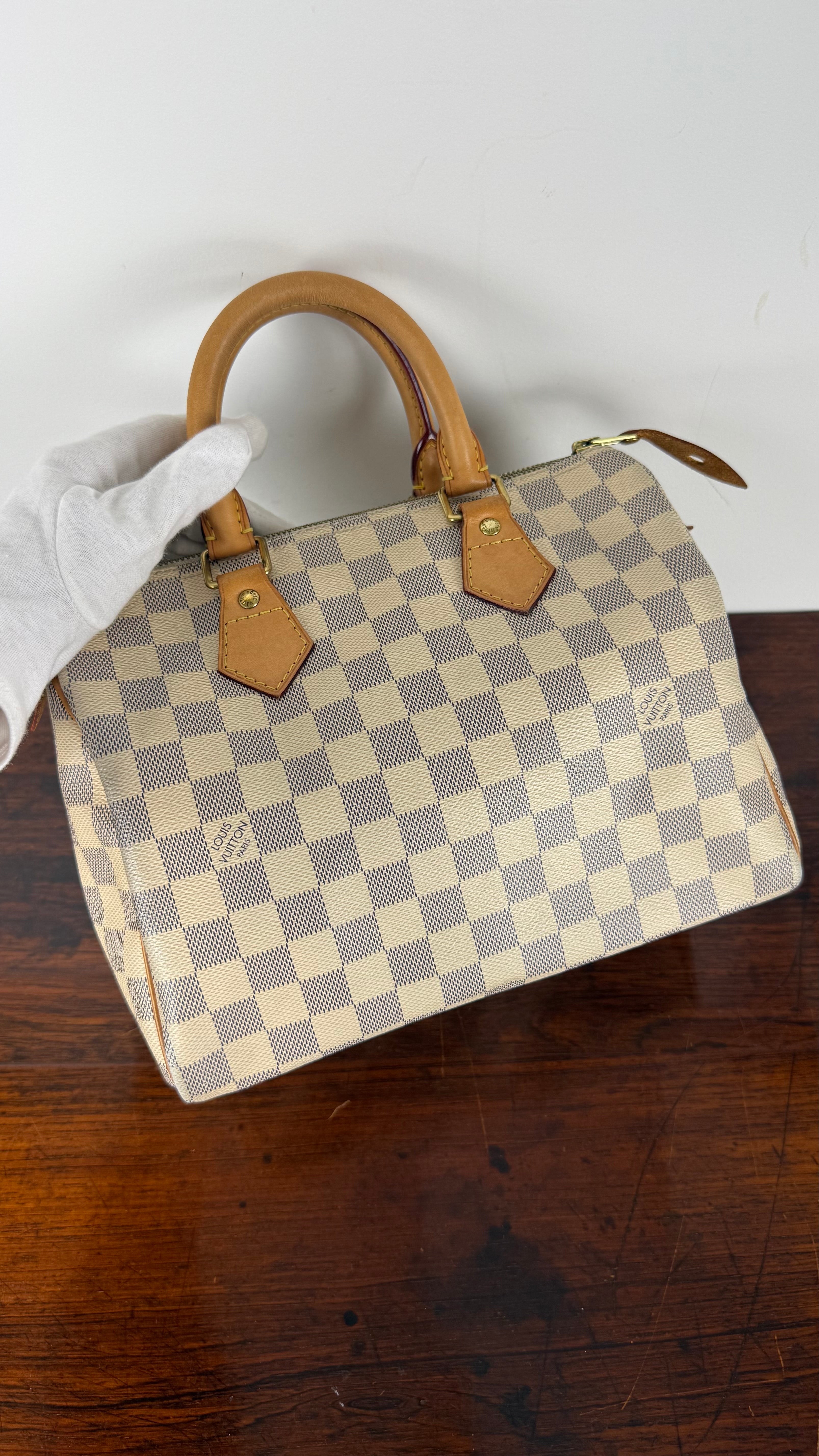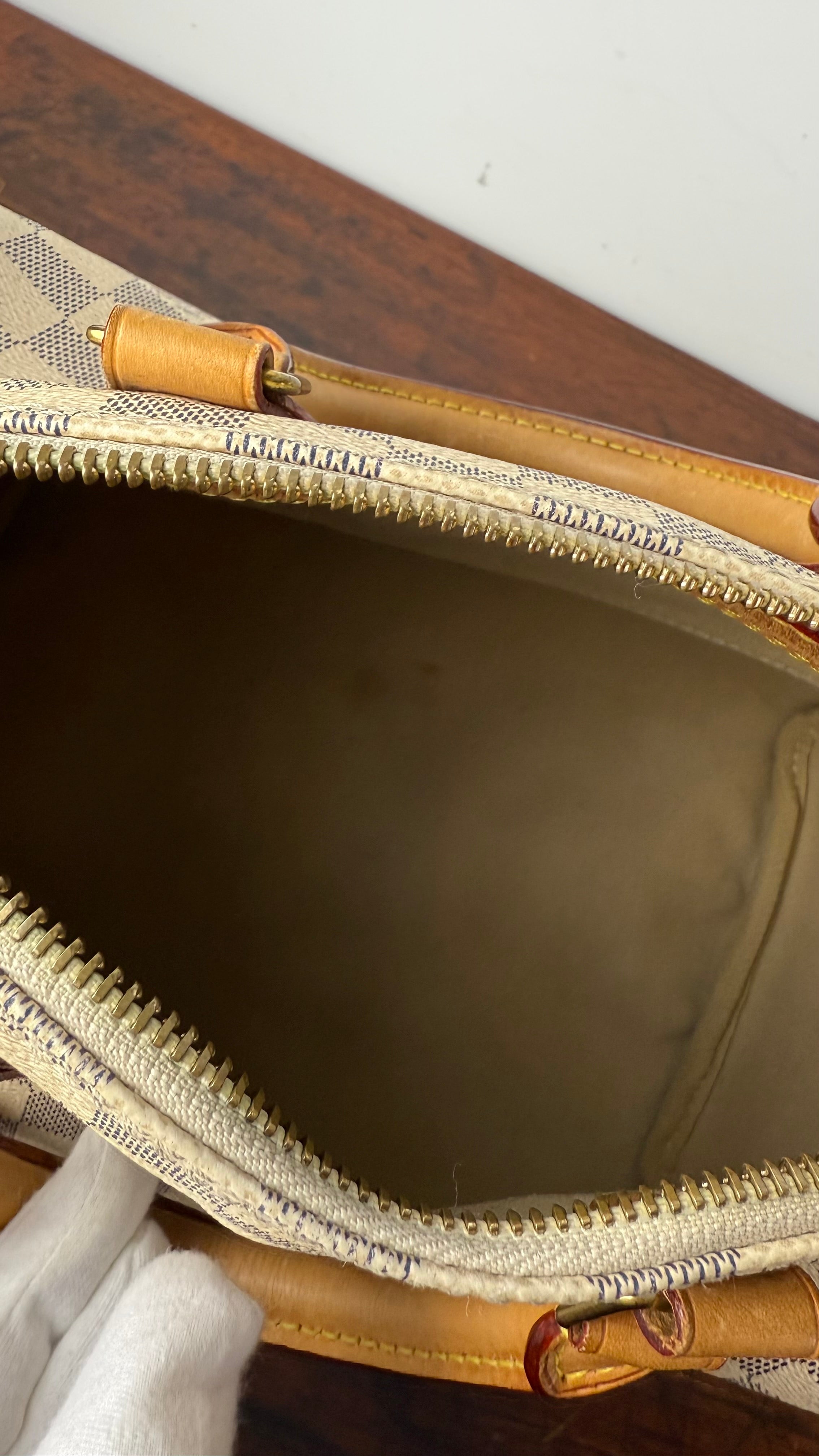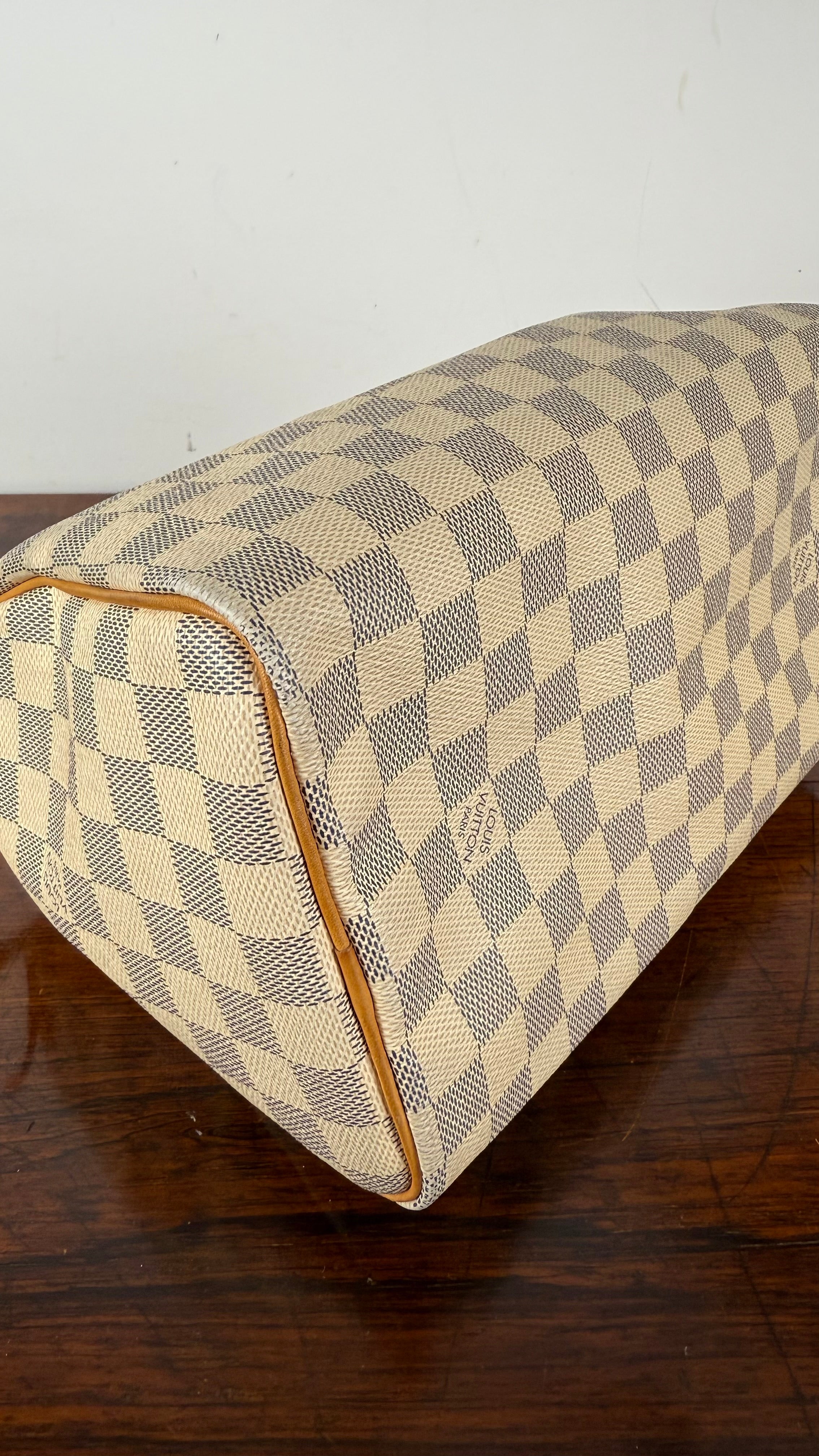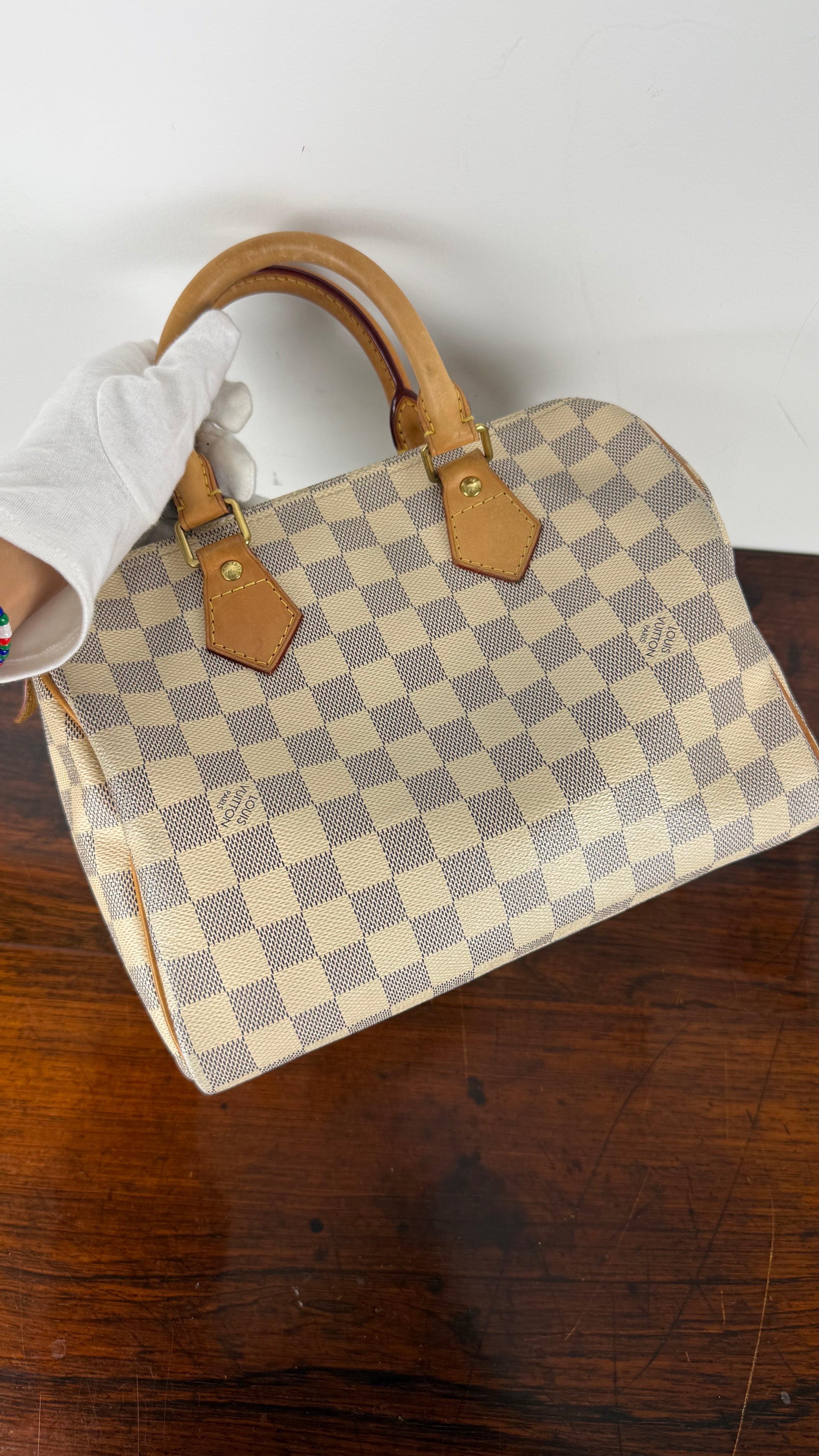 A Louis Vuitton Speedy 25 em canvas Damier Azur é uma versão elegante e refrescante da icônica bolsa Speedy, ideal para quem busca uma peça clássica com um toque de leveza e sofisticação. Introduzida originalmente nos anos 1930 como uma bolsa de viagem compacta, a Speedy 25 ganhou notoriedade nos anos 1960, especialmente após ser associada à atriz Audrey Hepburn.
