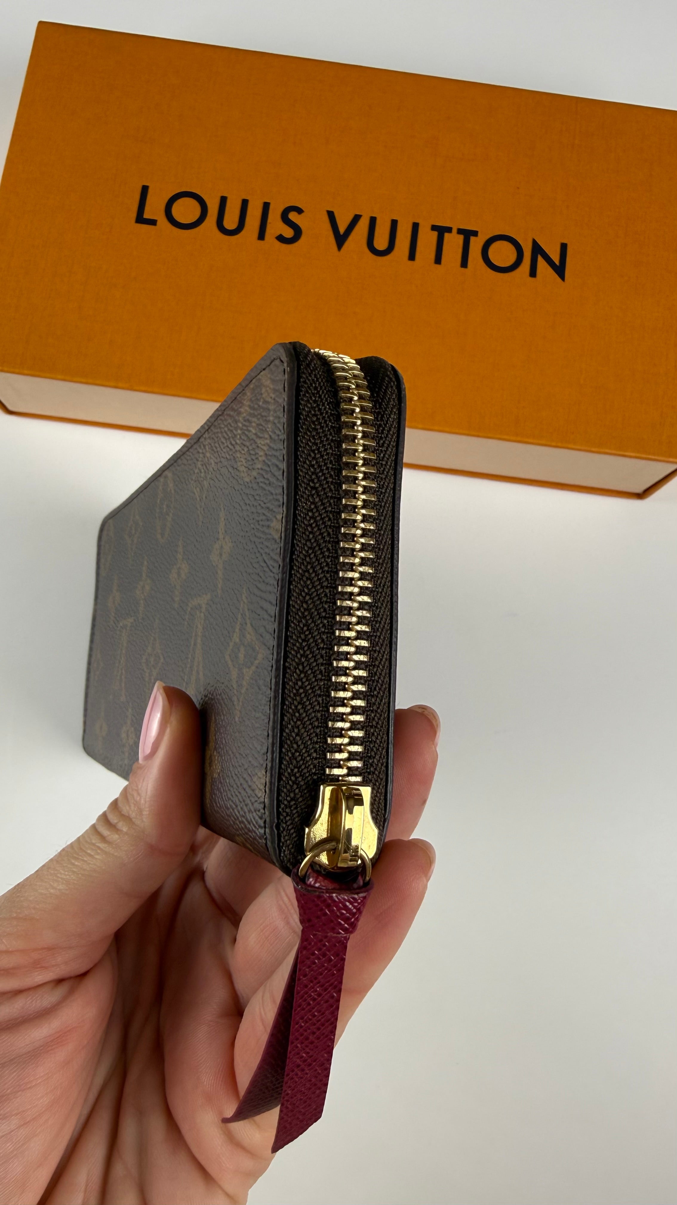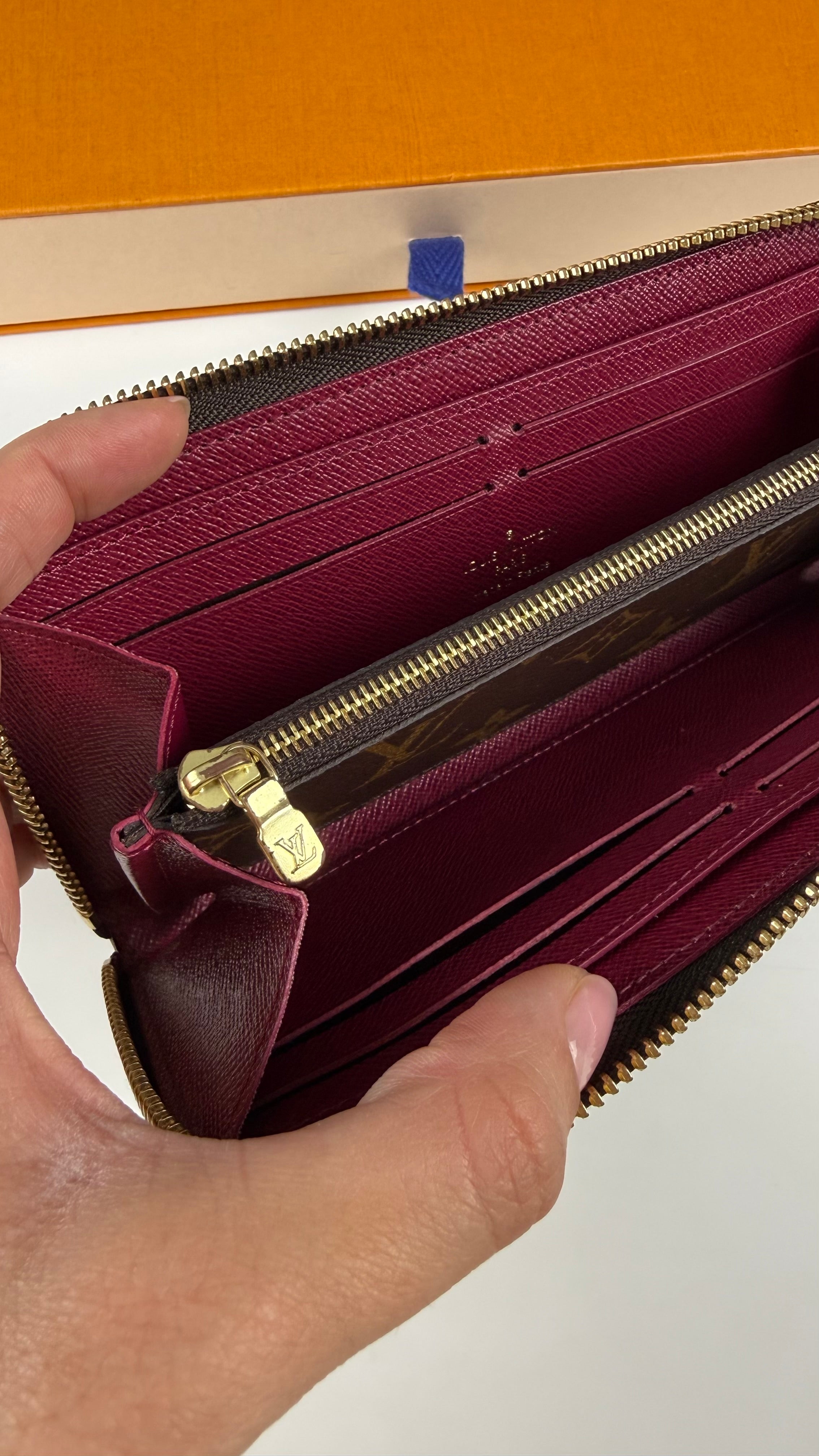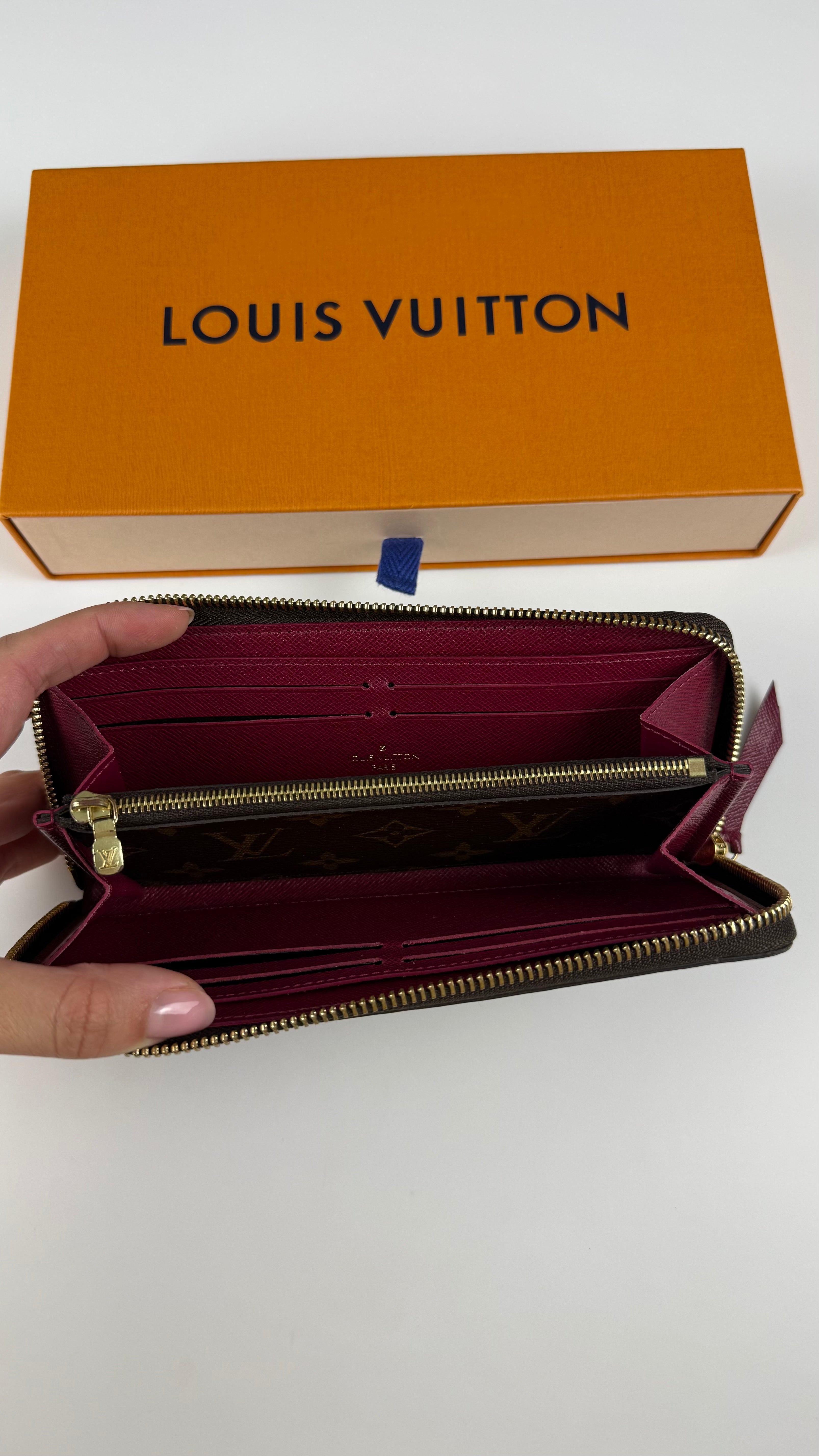 A carteira Louis Vuitton Zippy Clemence é uma das peças mais icónicas e práticas da marca, combinando elegância clássica com funcionalidade moderna. O modelo das imagens apresenta o famoso padrão Monogram Canvas no exterior e um interior em vermelho bordeaux, conferindo-lhe um contraste sofisticado.