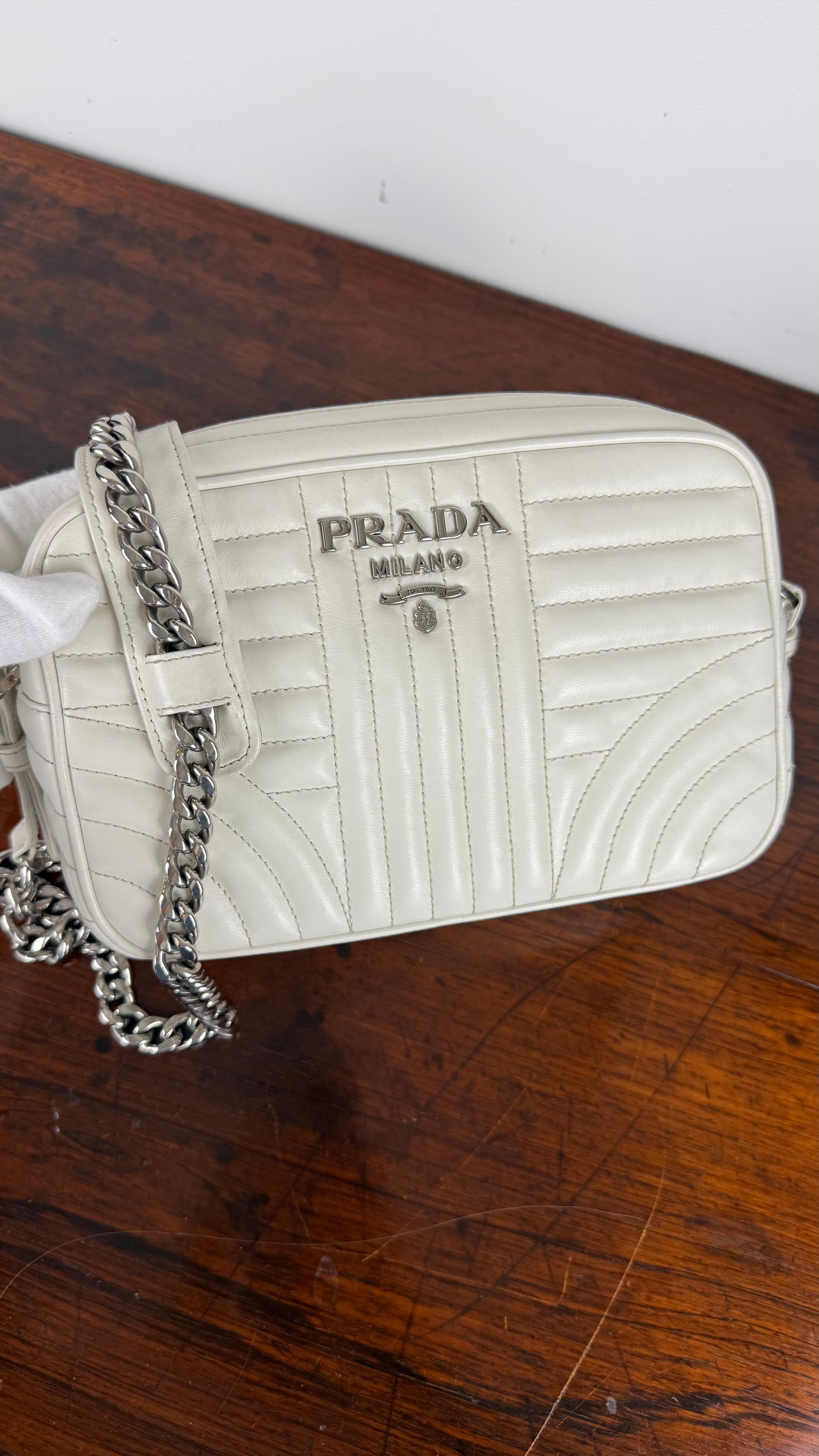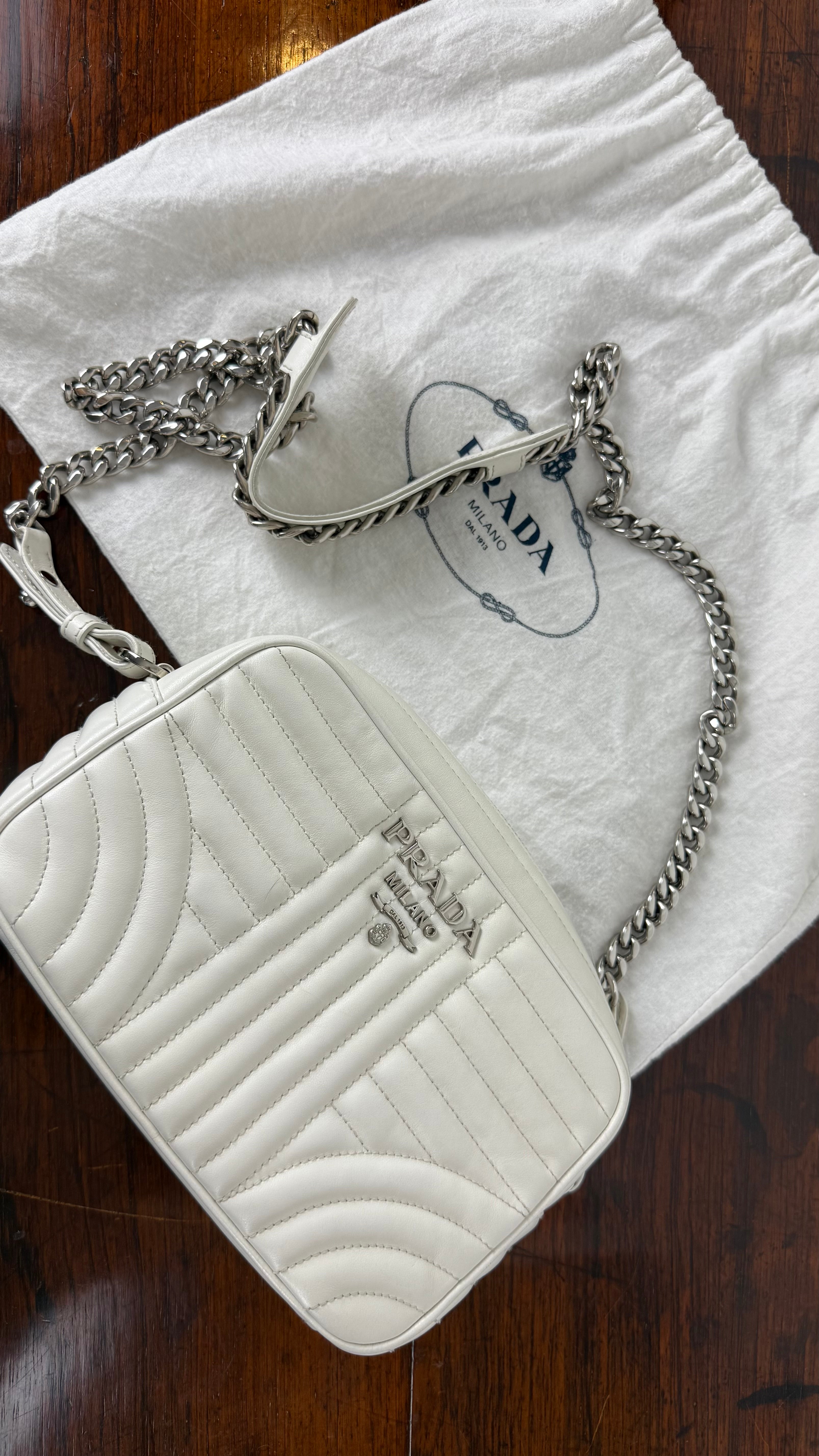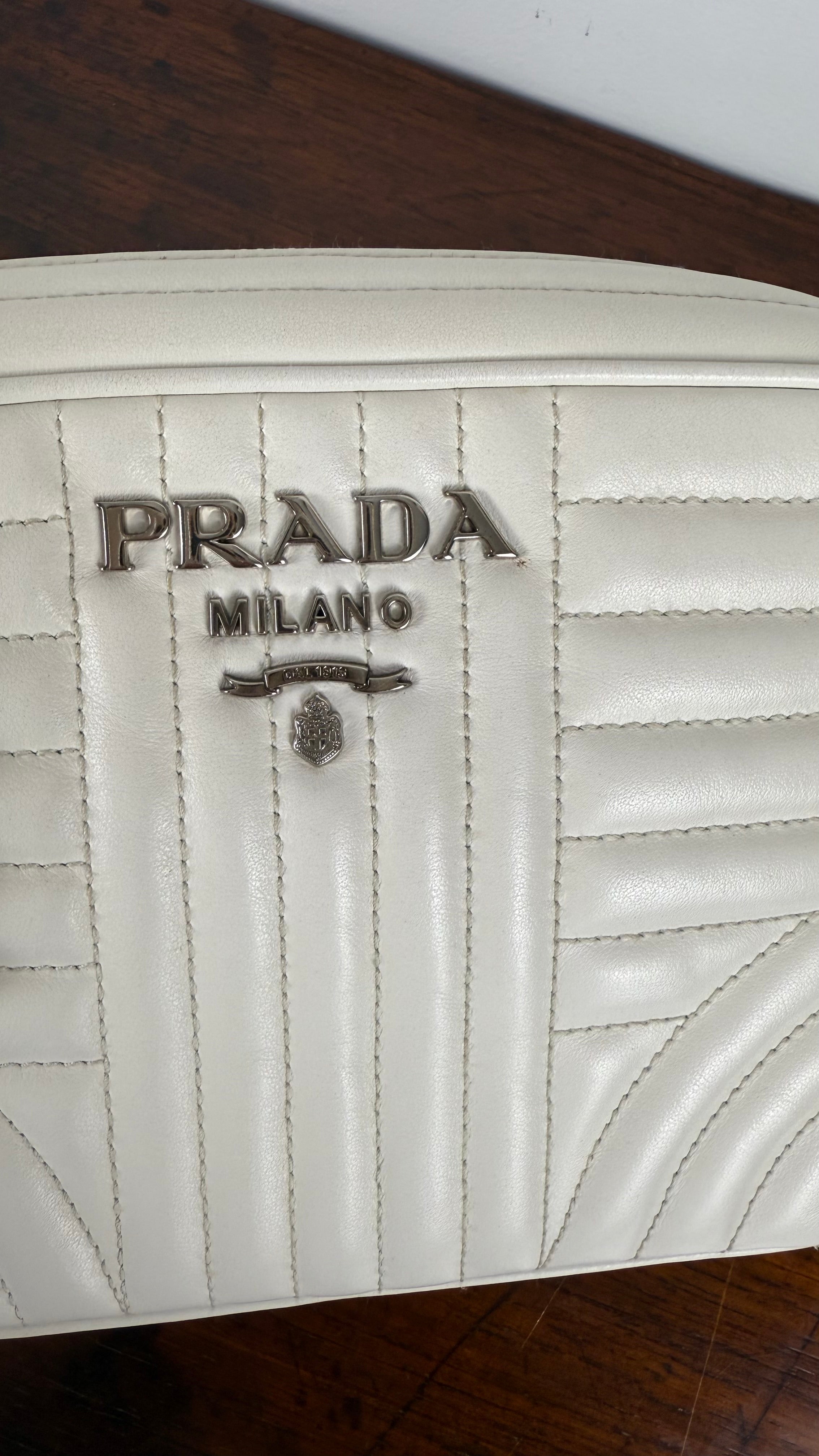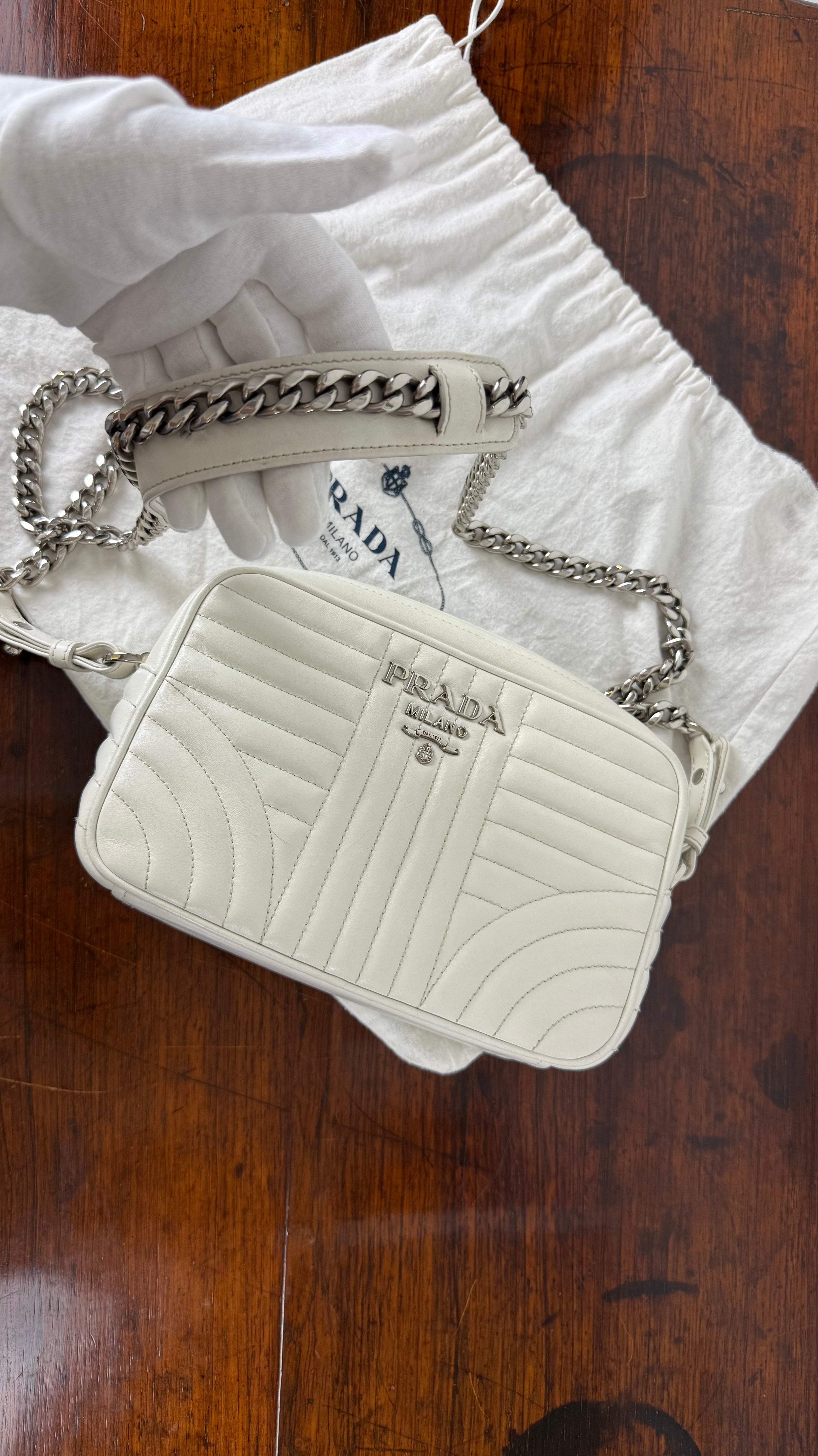 A Diagramme Camera Bag é um modelo icónico da Prada, que alia linhas modernas ao luxo intemporal da marca italiana. Confeccionada em pele de vitela macia, distingue-se pelo padrão de costura geométrica inspirado na coleção Diagramme, que confere textura e sofisticação à peça.