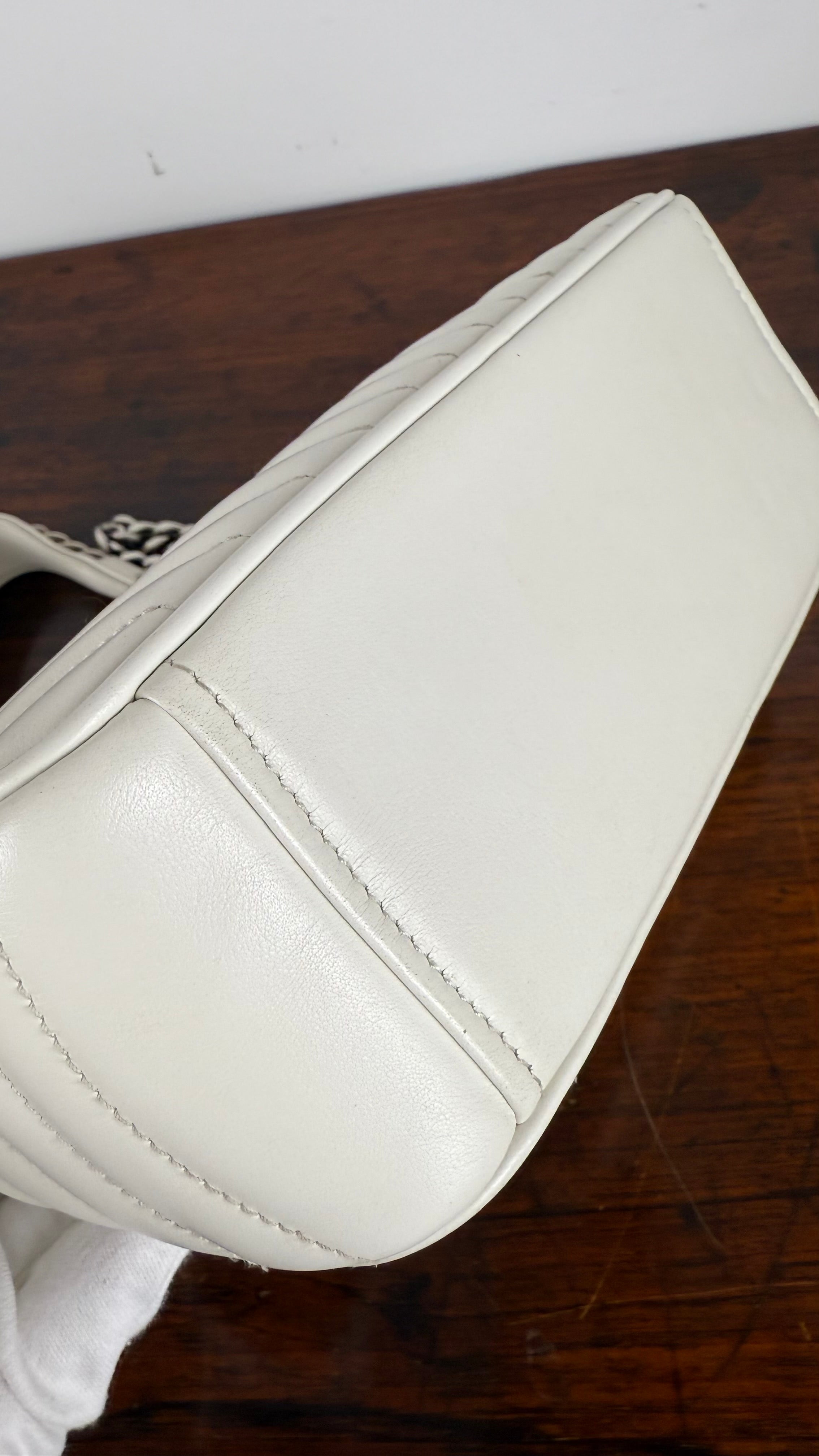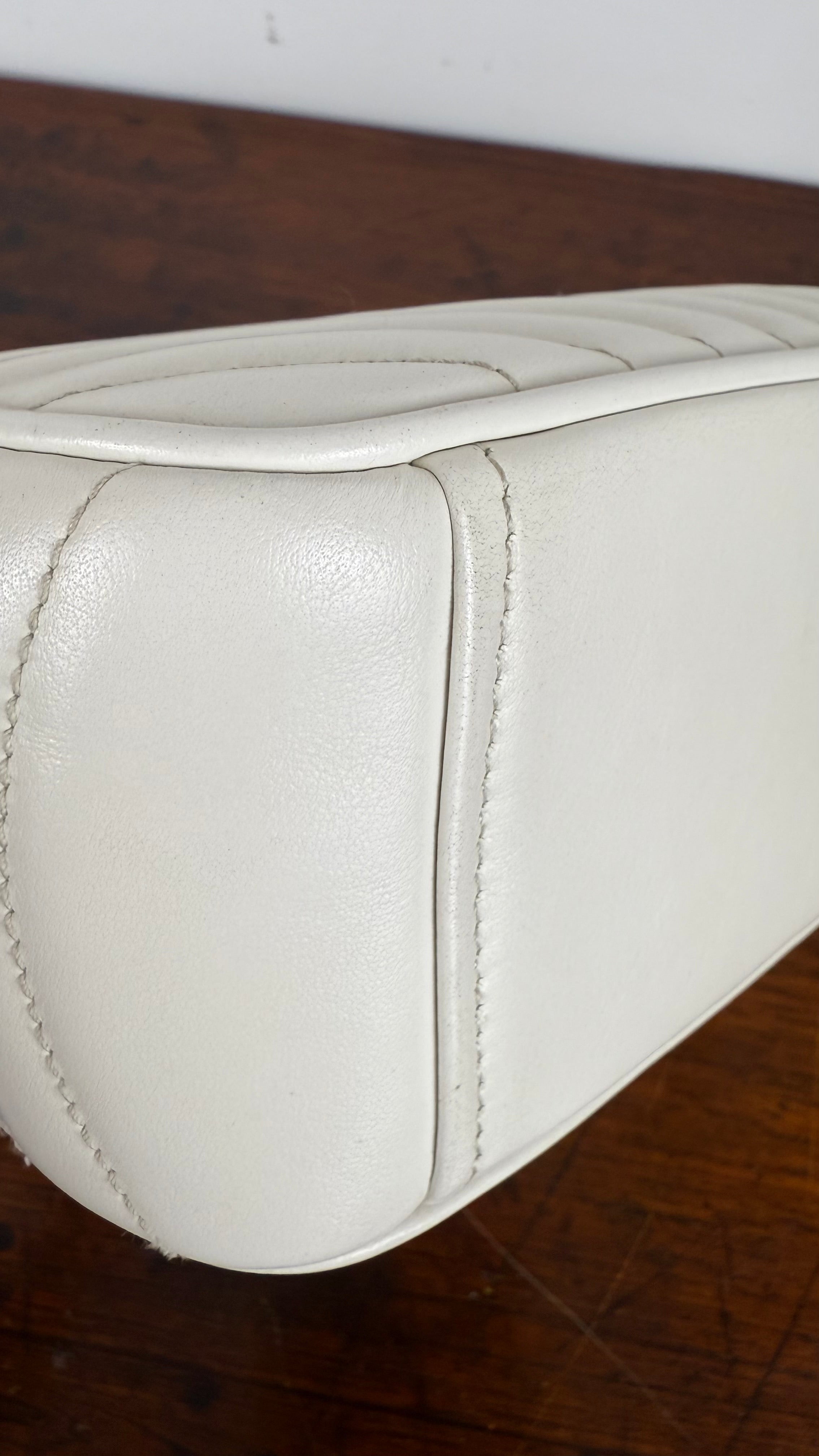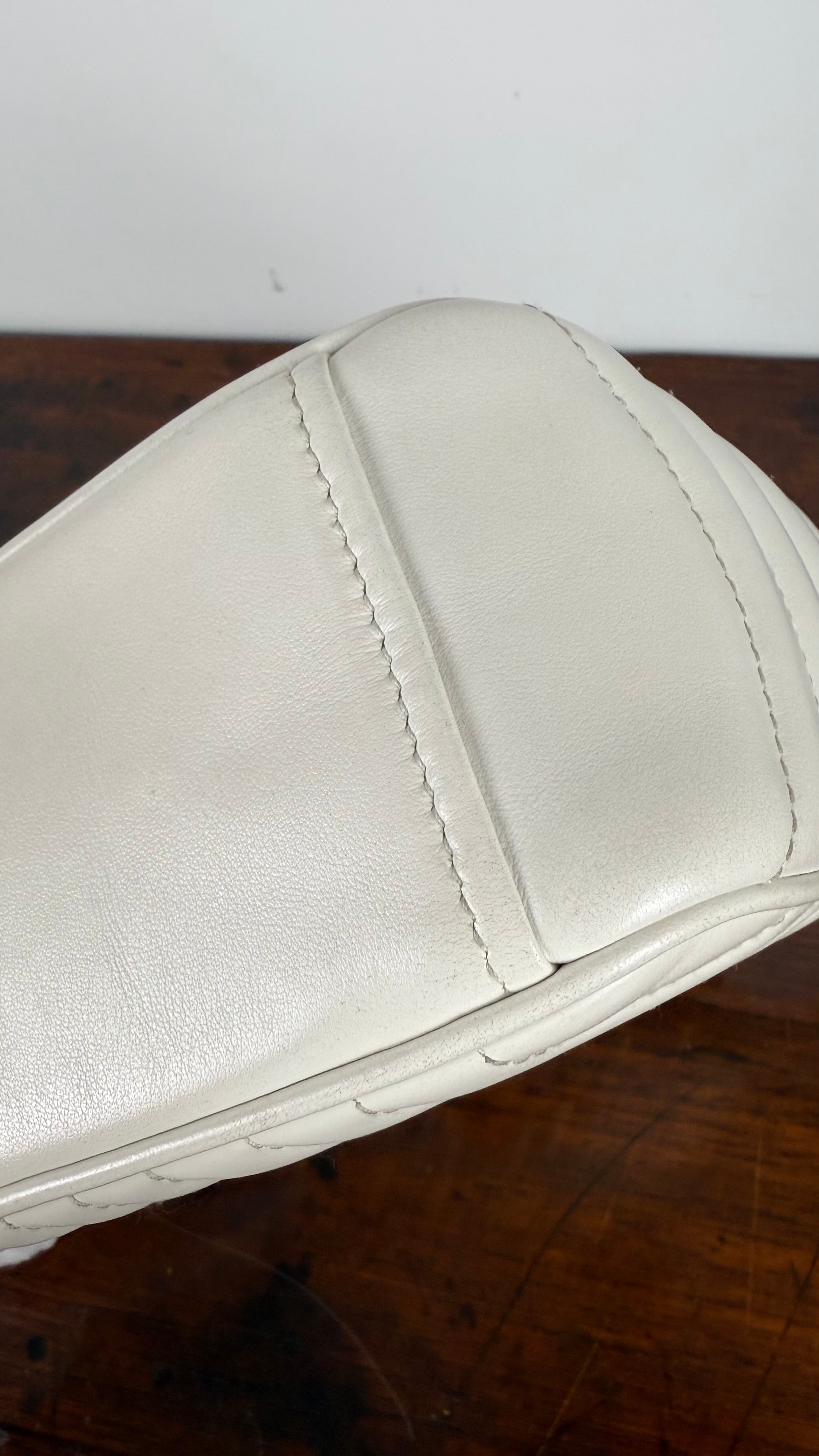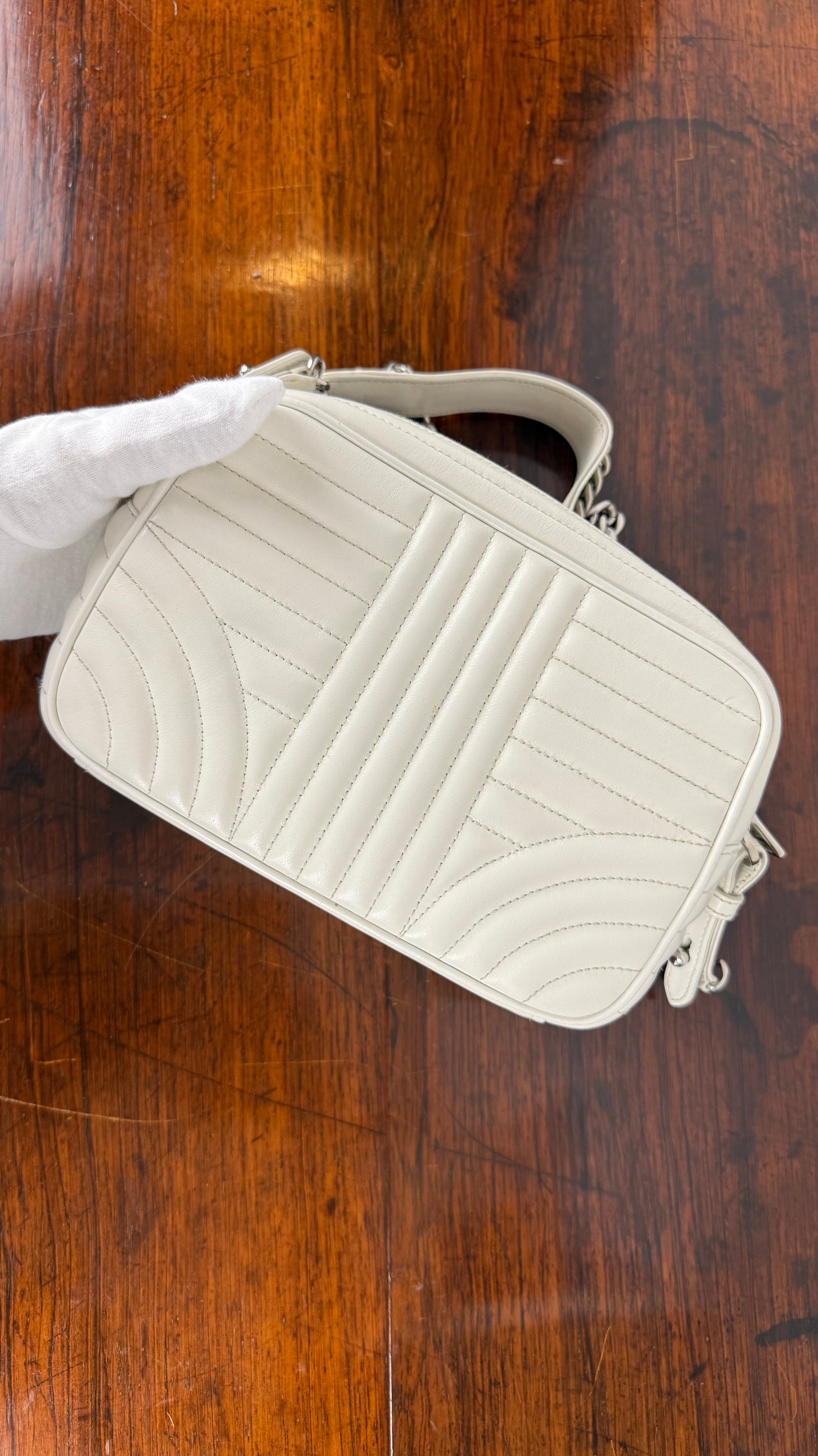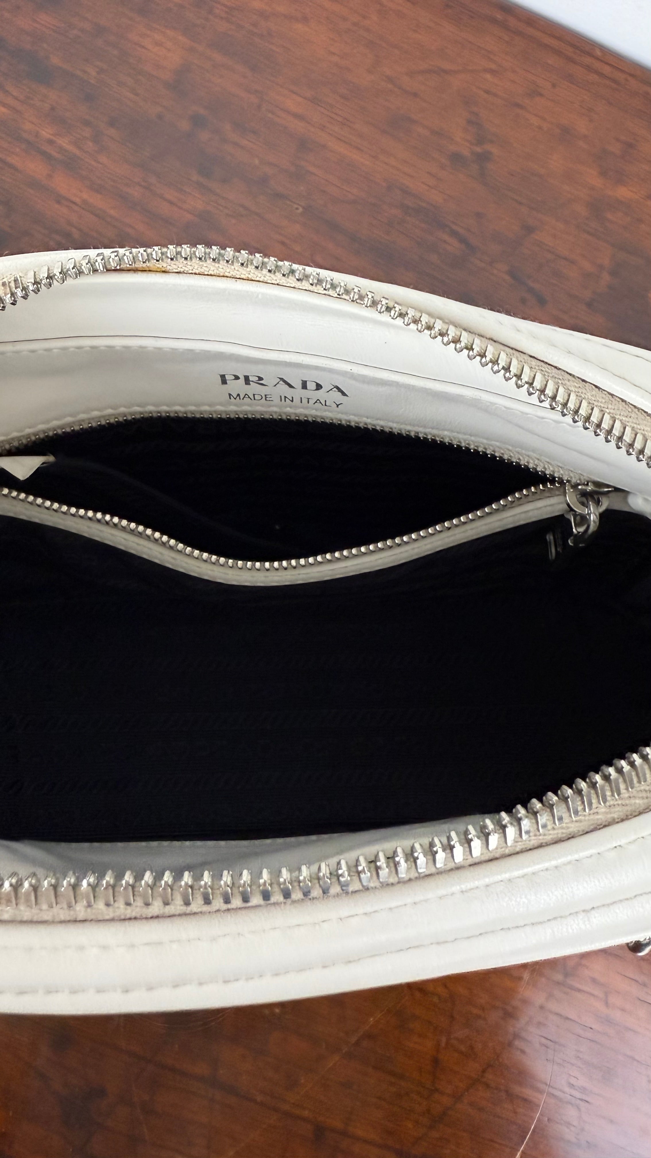 A Diagramme Camera Bag é um modelo icónico da Prada, que alia linhas modernas ao luxo intemporal da marca italiana. Confeccionada em pele de vitela macia, distingue-se pelo padrão de costura geométrica inspirado na coleção Diagramme, que confere textura e sofisticação à peça.