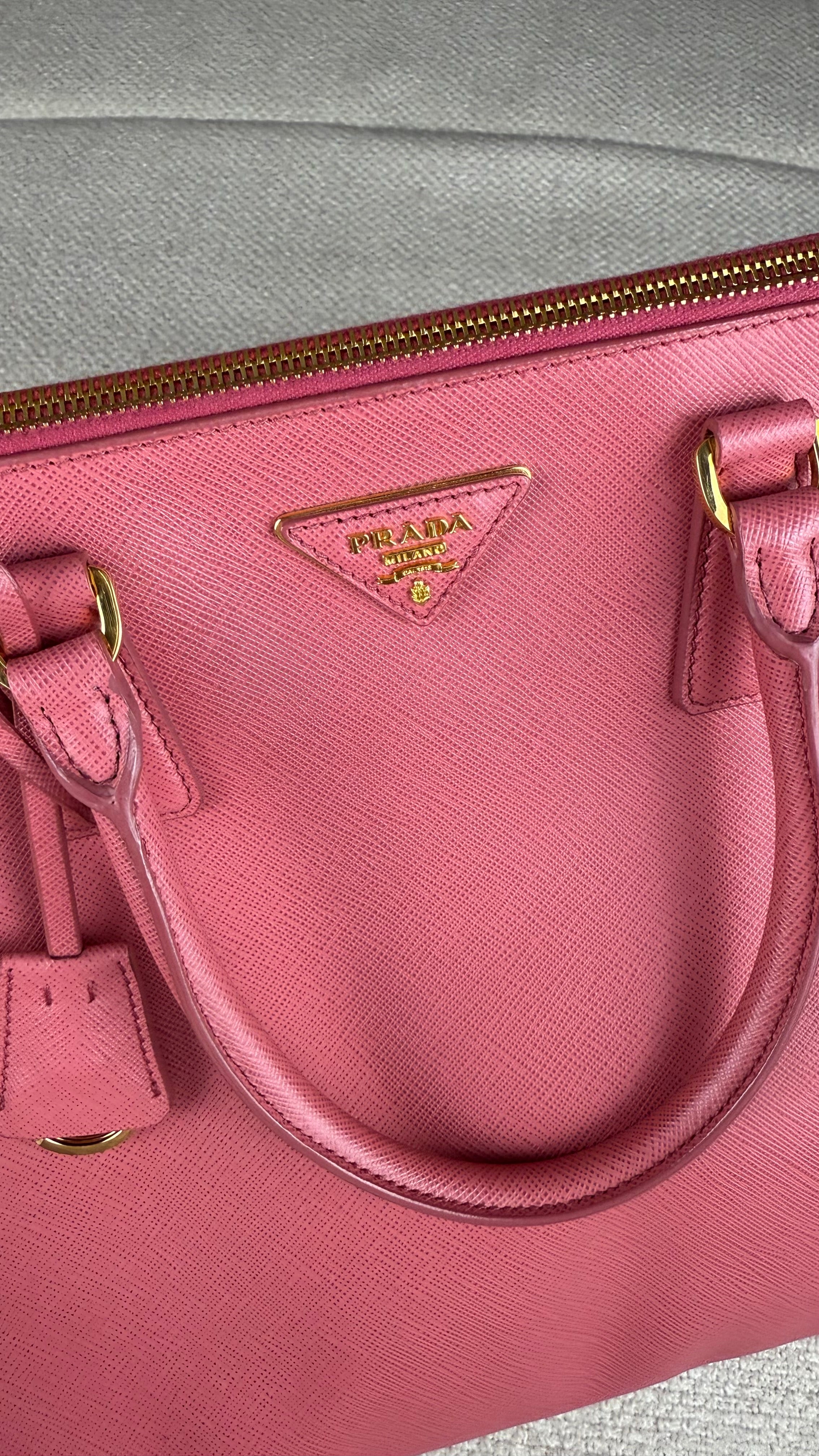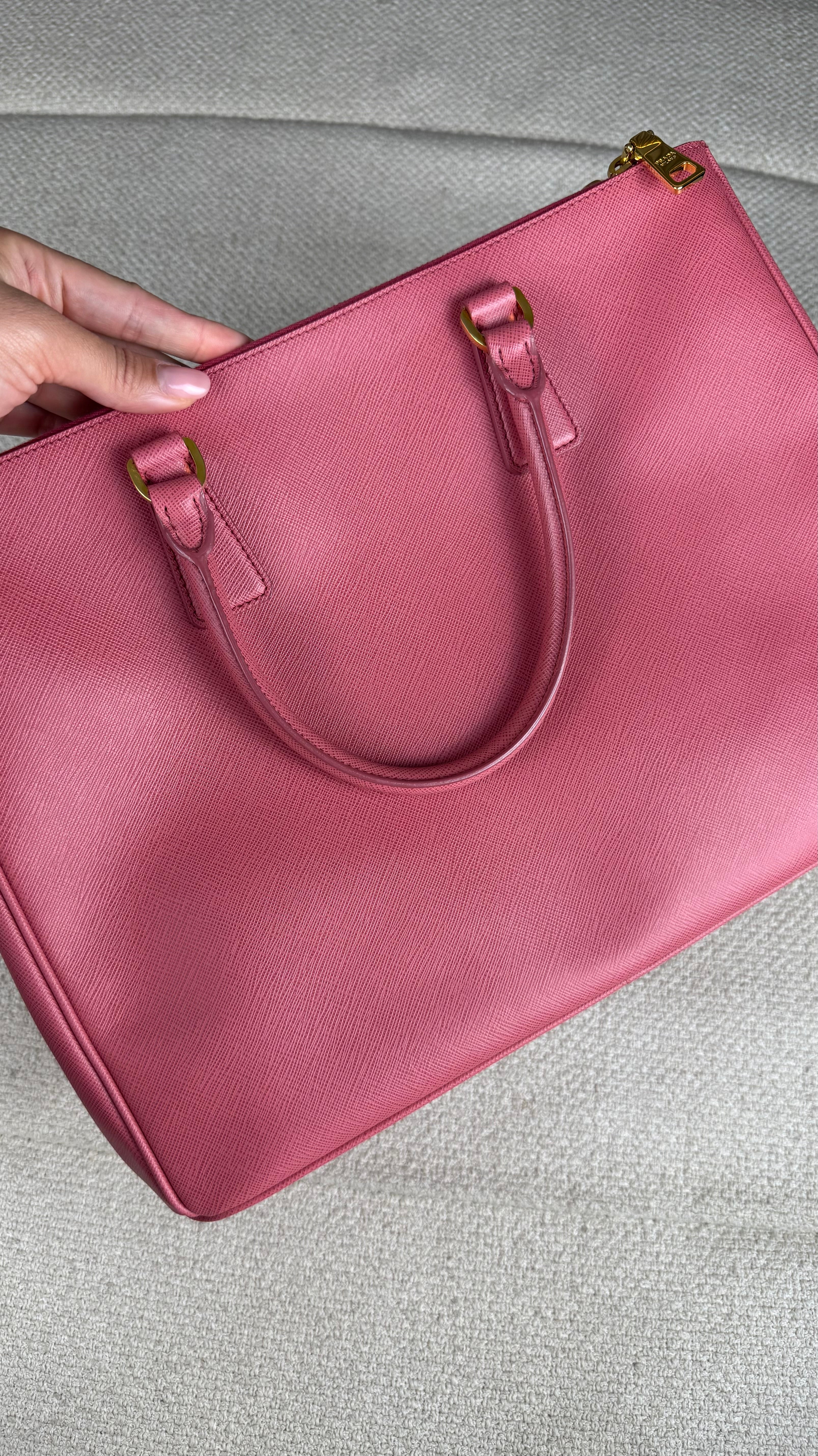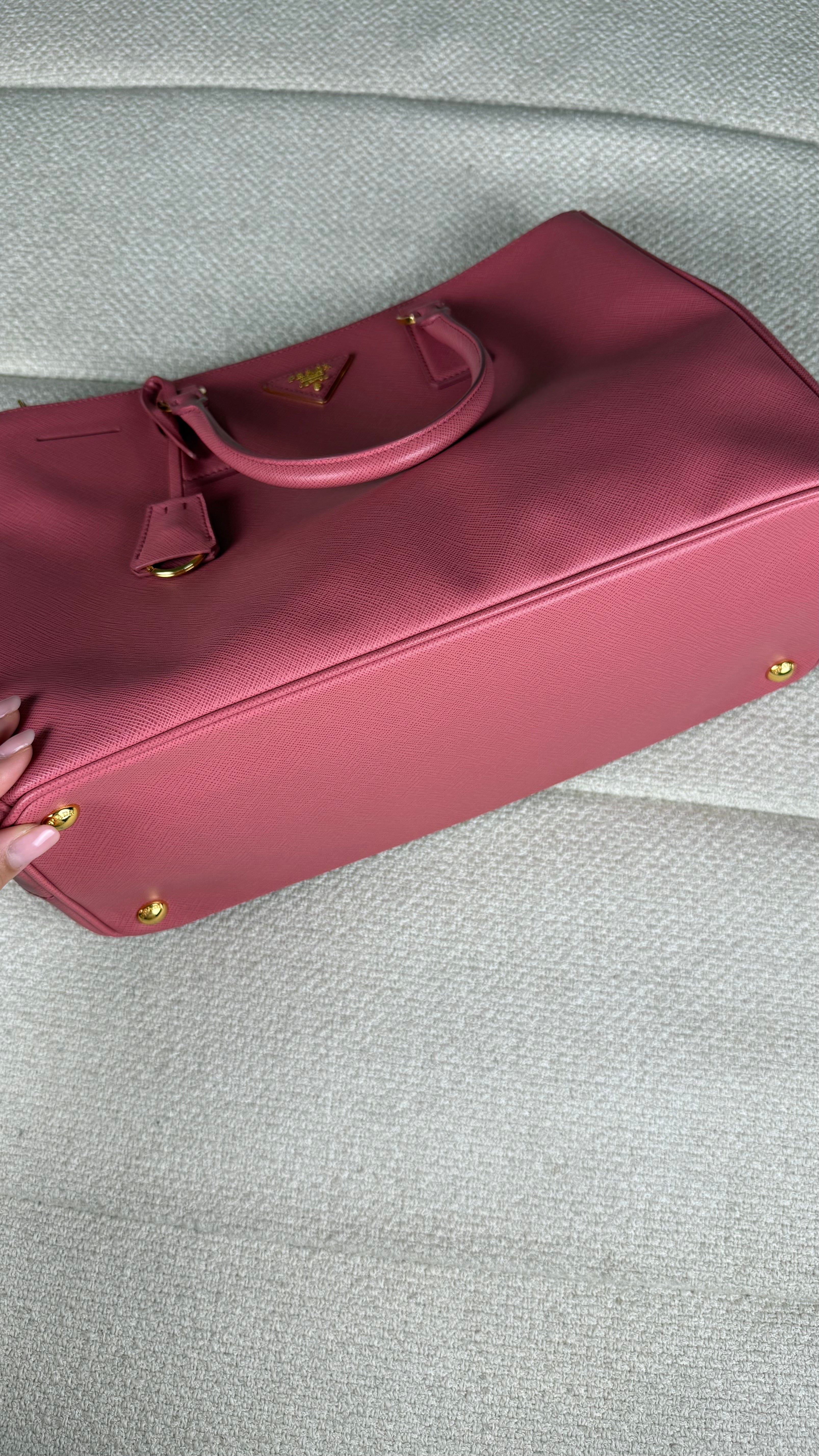 Esta versão Large é confeccionada em couro Saffiano, material patenteado por Mario Prada, conhecido pela sua durabilidade e textura exclusiva. Na cor rosa (Pink/Tamaris), alia feminilidade e modernidade, destacando-se como uma peça elegante para o dia a dia.