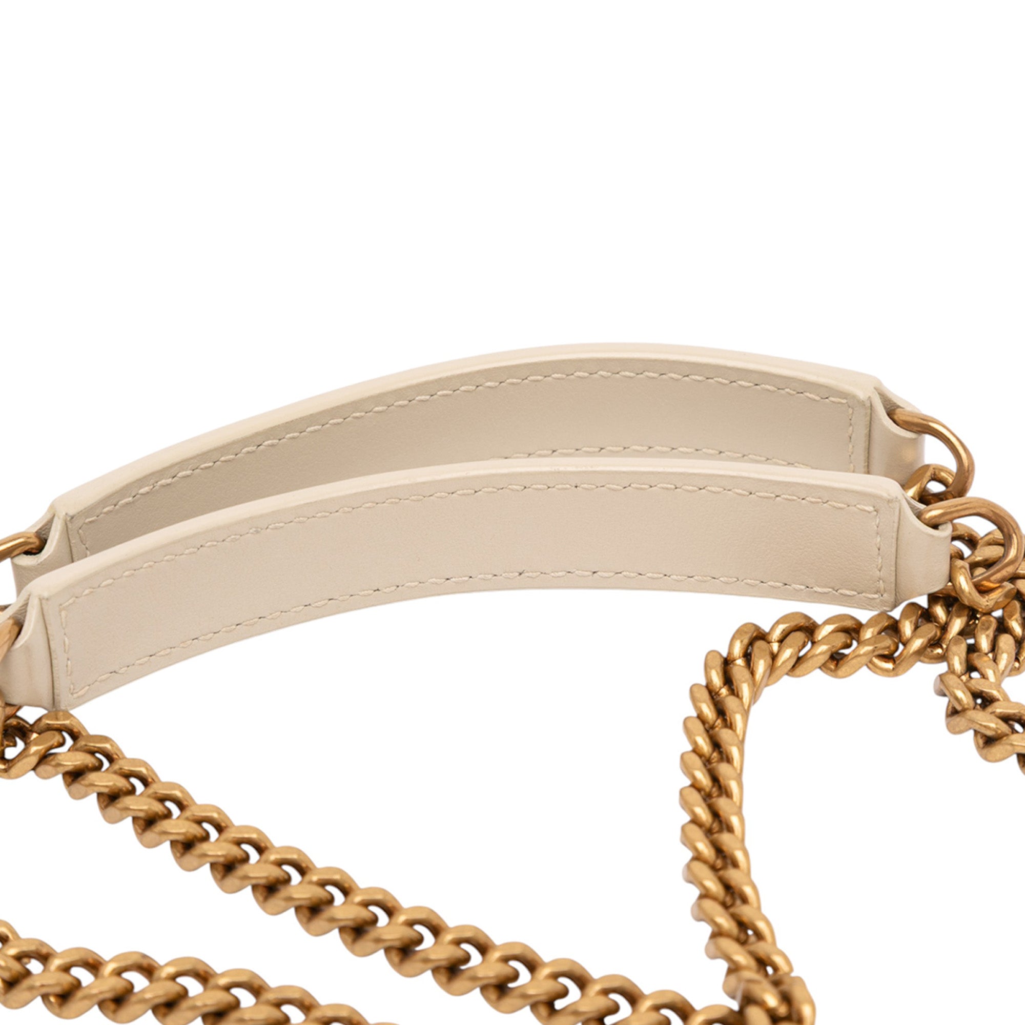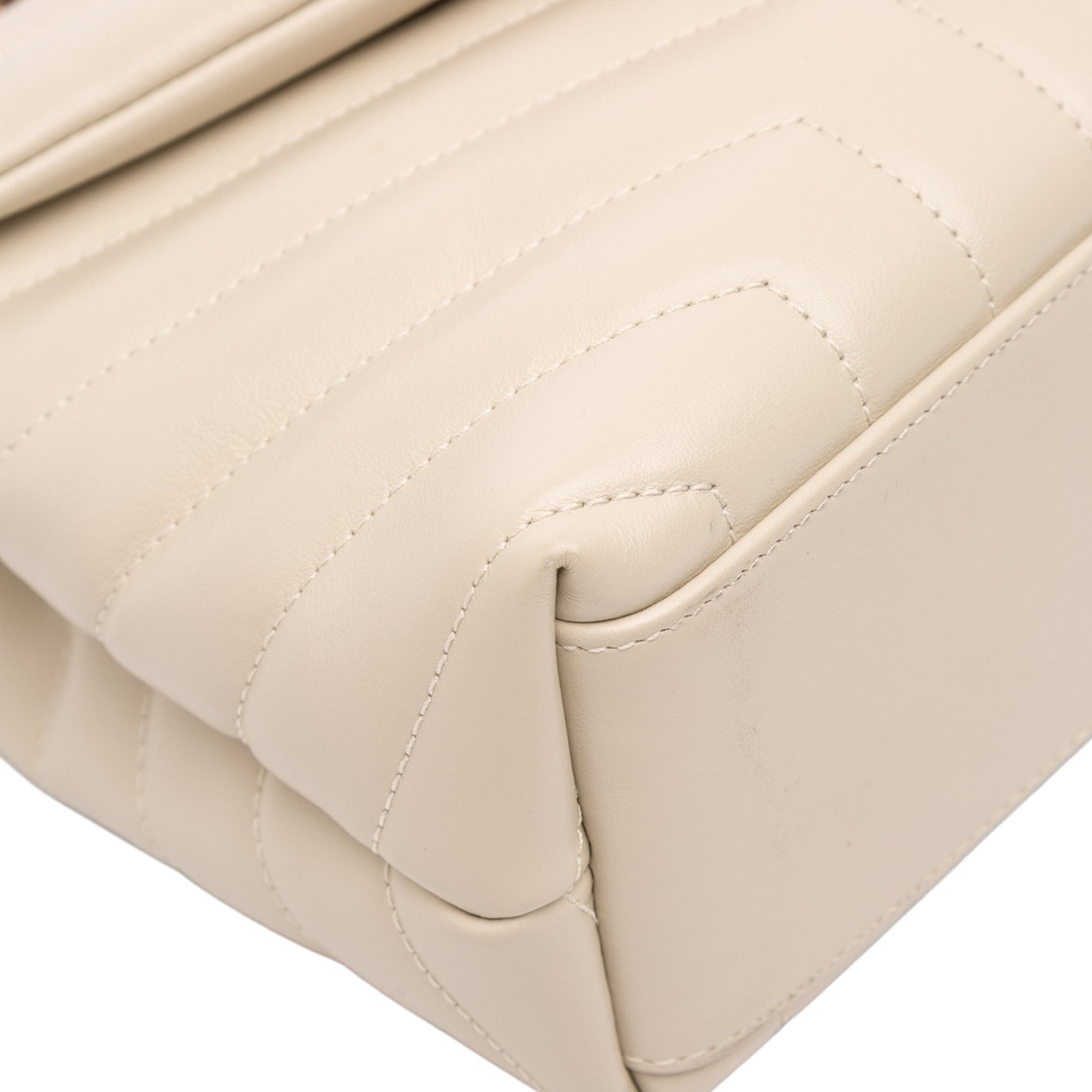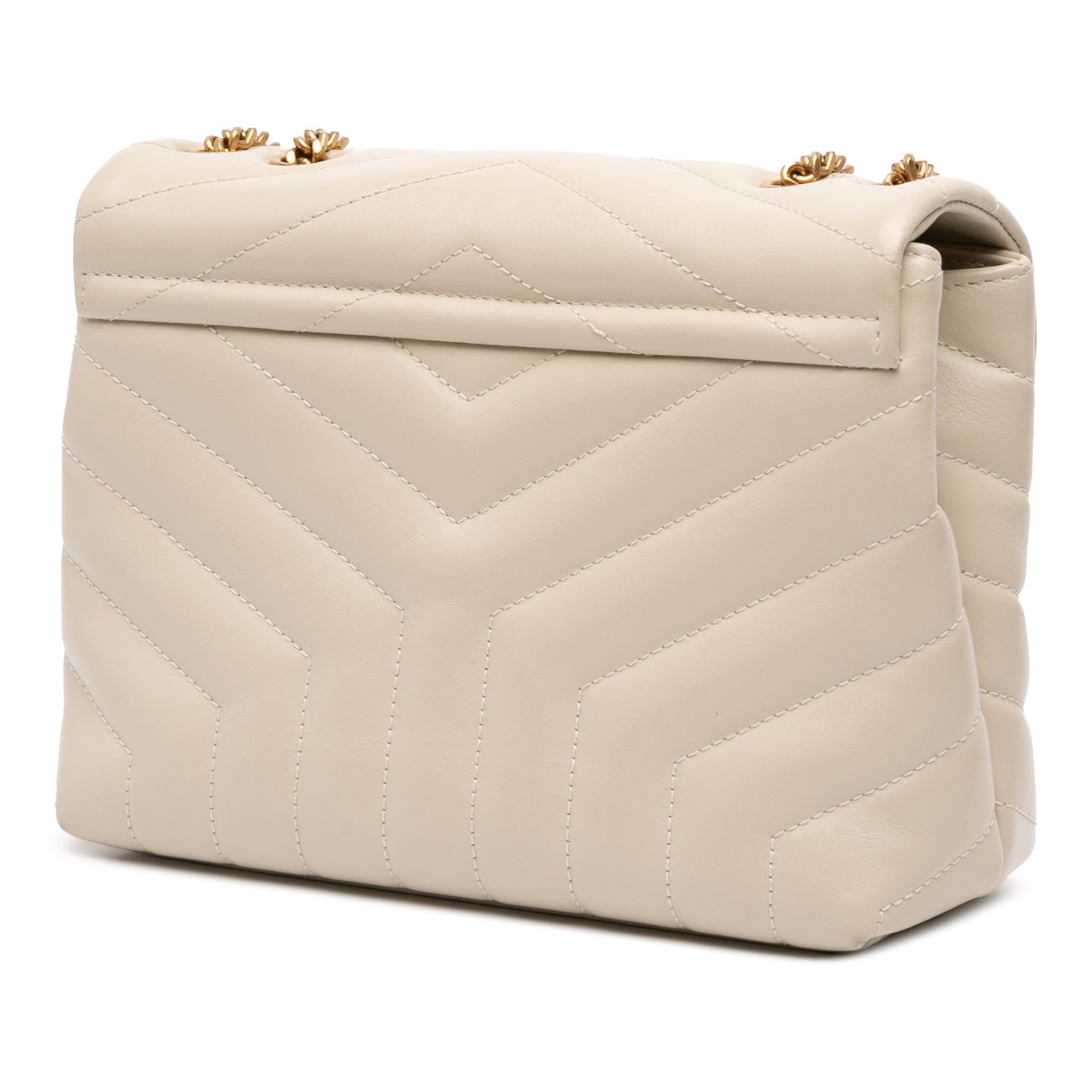 A Bolsa LouLou Small da Saint Laurent é um ícone de elegância atemporal. Confeccionada em couro macio com acabamento matelassê em padrão chevron, traz o icônico monograma YSL em metal dourado envelhecido na aba frontal. Seu design estruturado combina sofisticação e praticidade, com alça de corrente ajustável e alça superior para diferentes formas de uso — no ombro, transversal ou à mão.