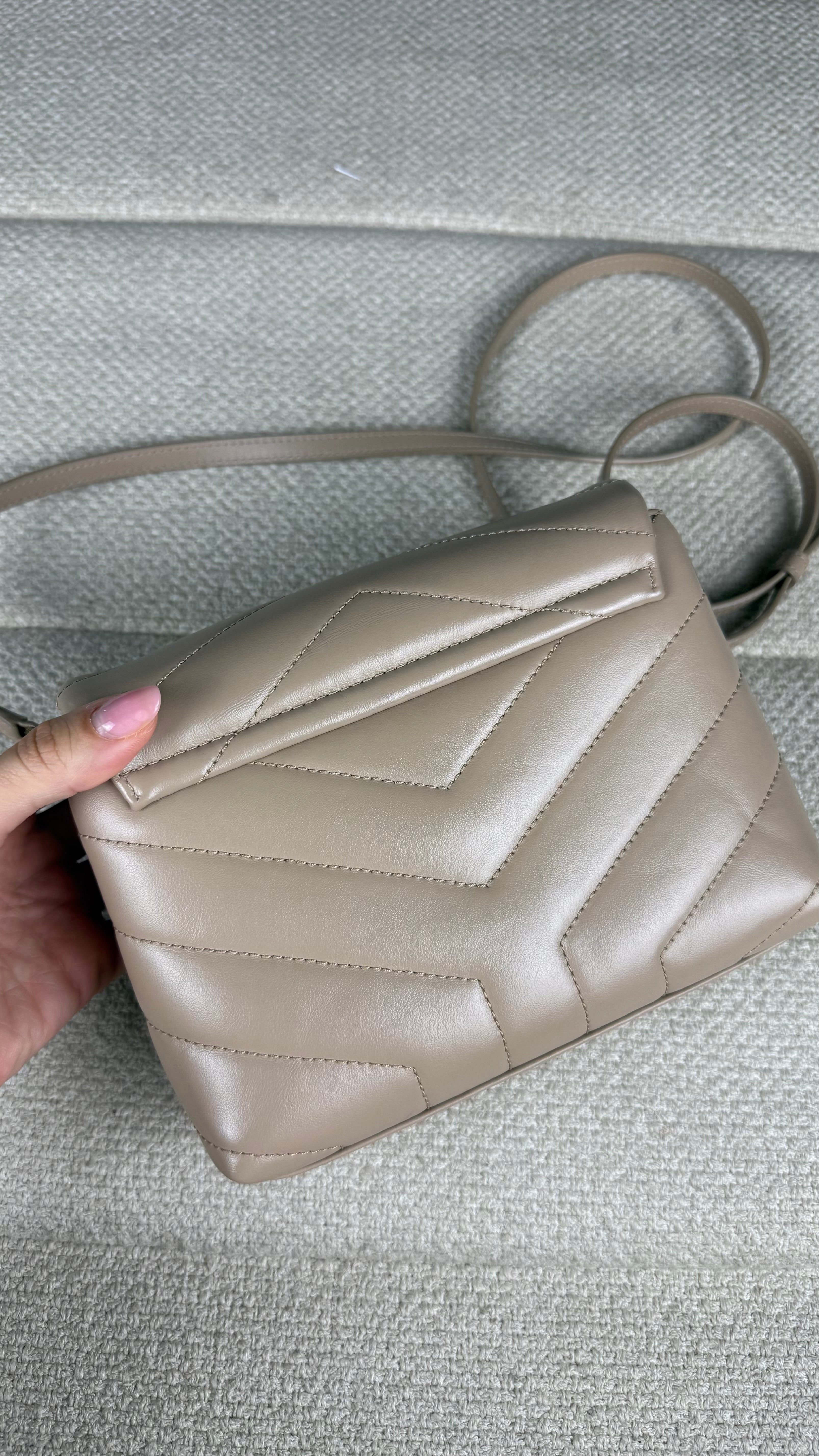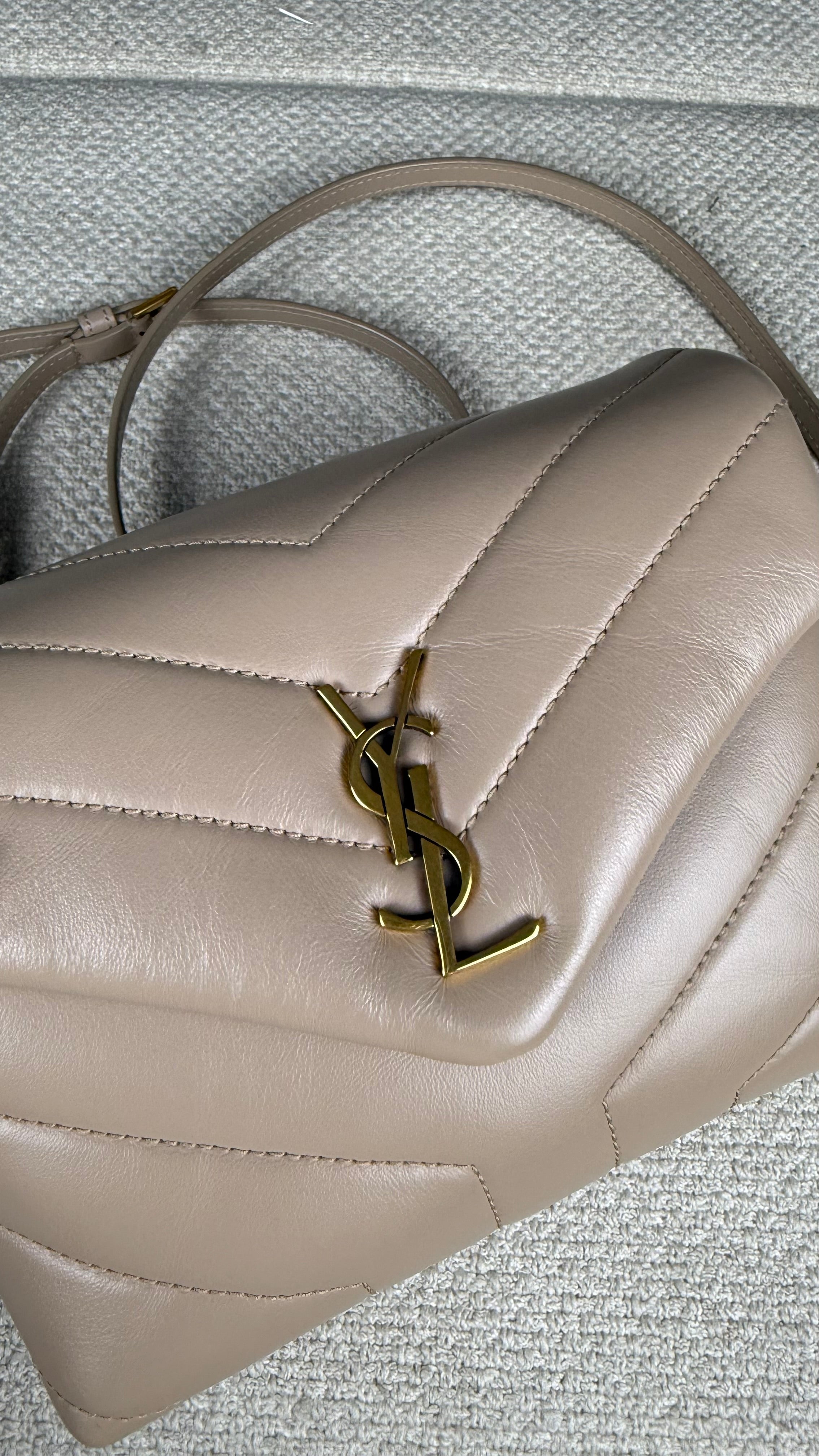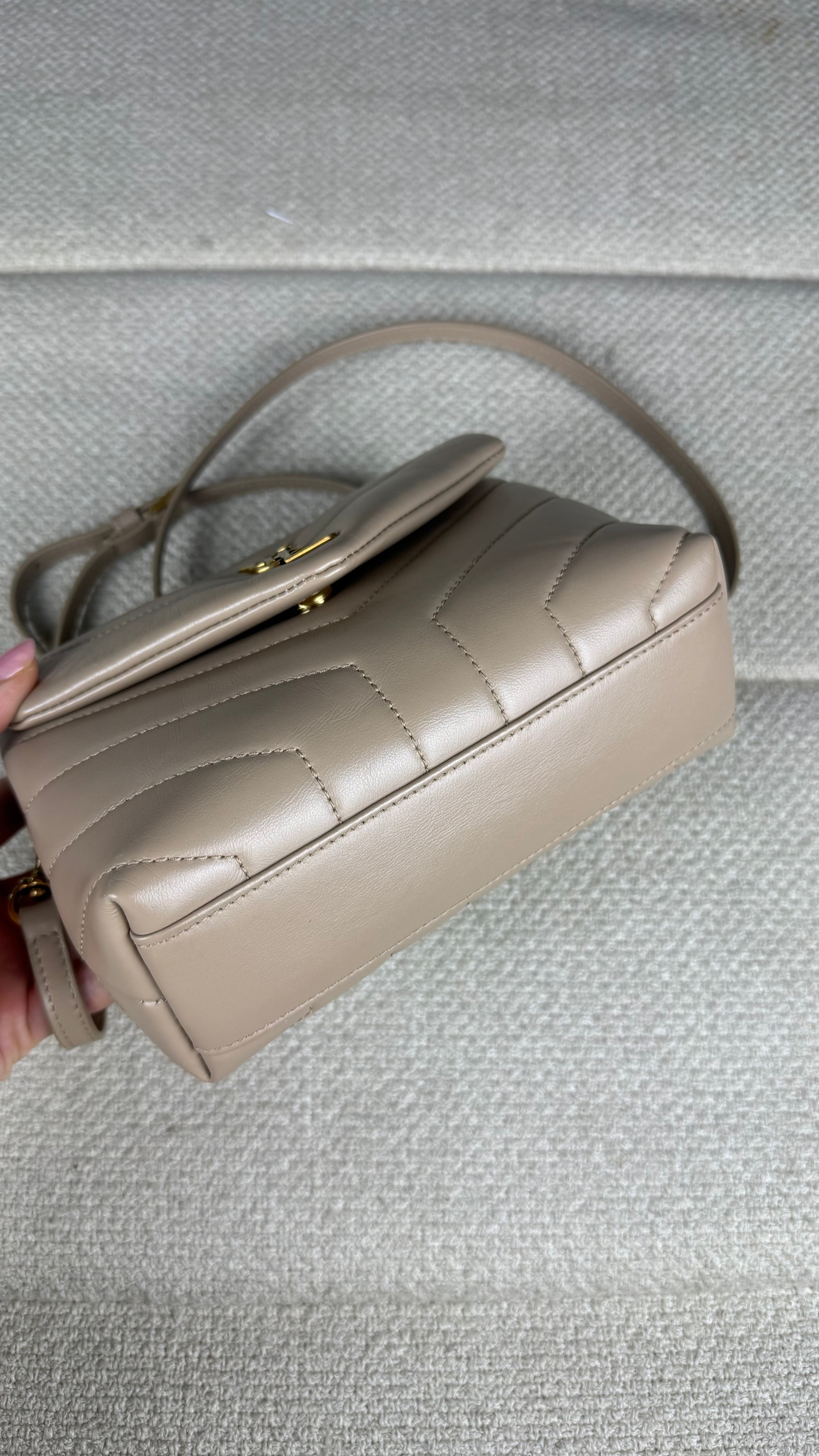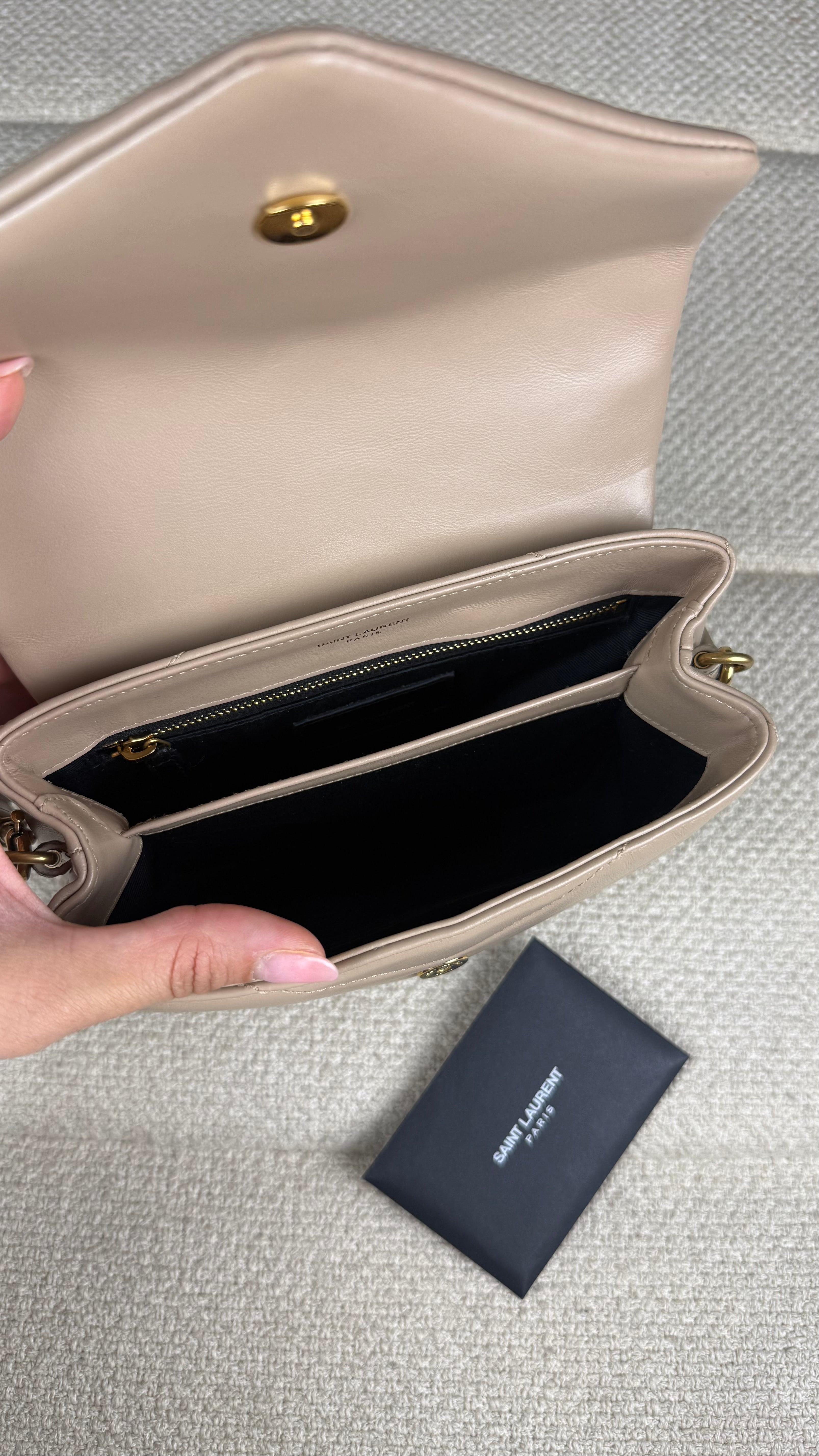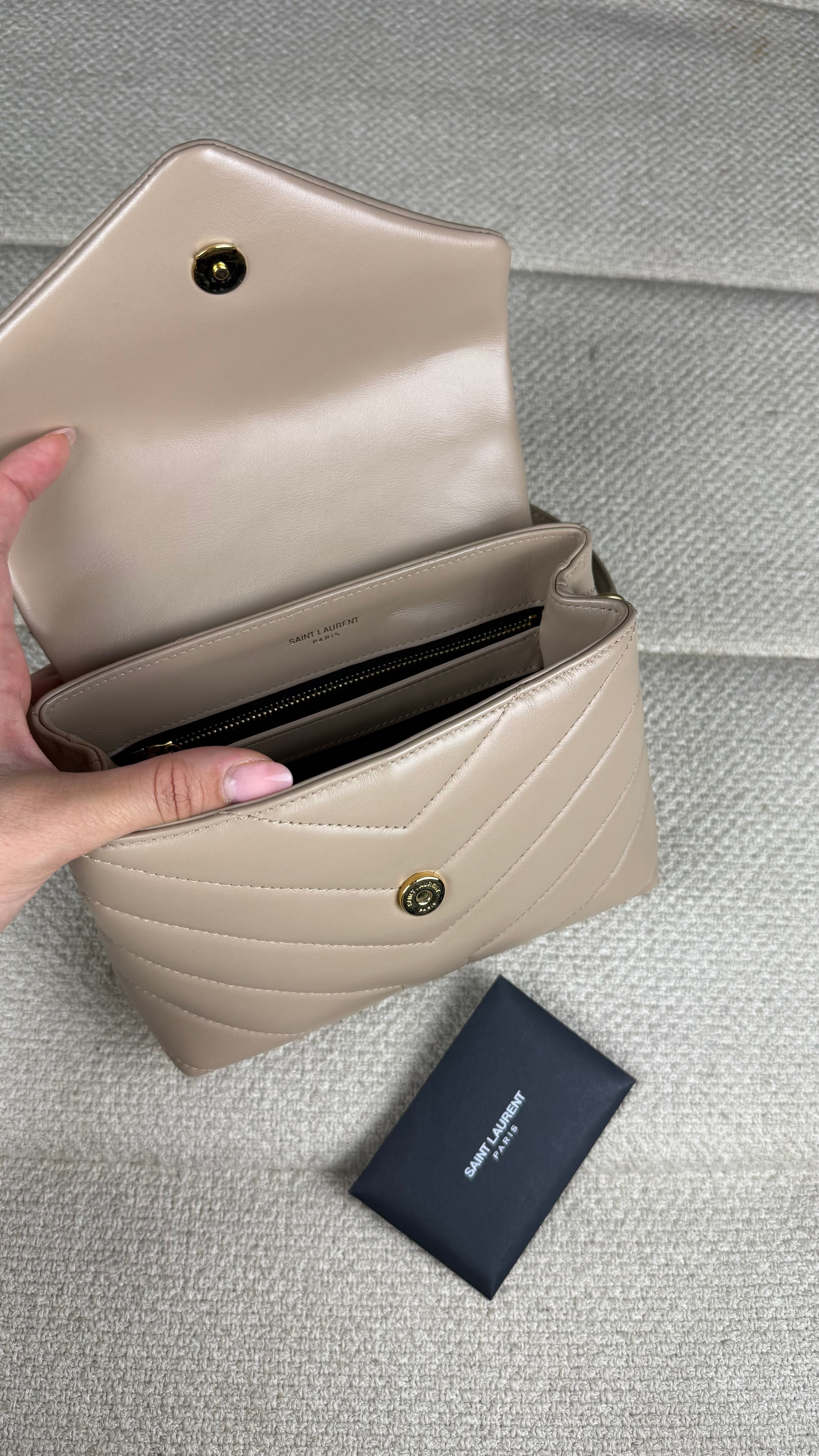 A Loulou Toy é um dos modelos mais desejados da Saint Laurent, combinando design sofisticado, praticidade e estilo atemporal. Confeccionada em couro macio acolchoado com costura em chevron, a bolsa apresenta o icônico monograma YSL em metal dourado na aba frontal, símbolo máximo de elegância da maison francesa.