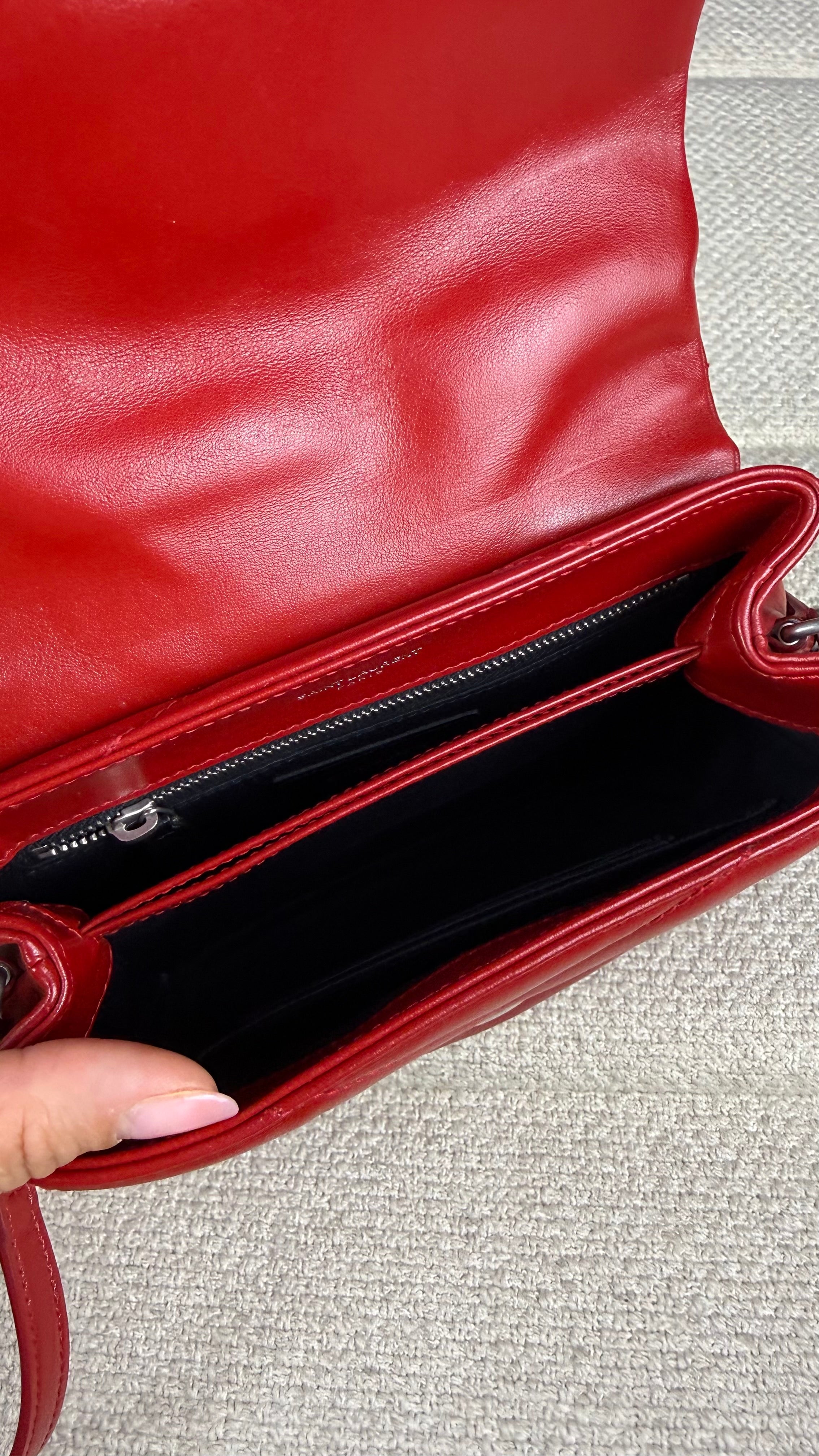 Confeccionada em couro macio matelassê com o característico padrão em “V”, o modelo exibe o monograma YSL em metal prateado na aba frontal, símbolo atemporal da Maison. Seu tamanho compacto e formato estruturado a tornam ideal para o dia a dia ou para eventos noturnos.